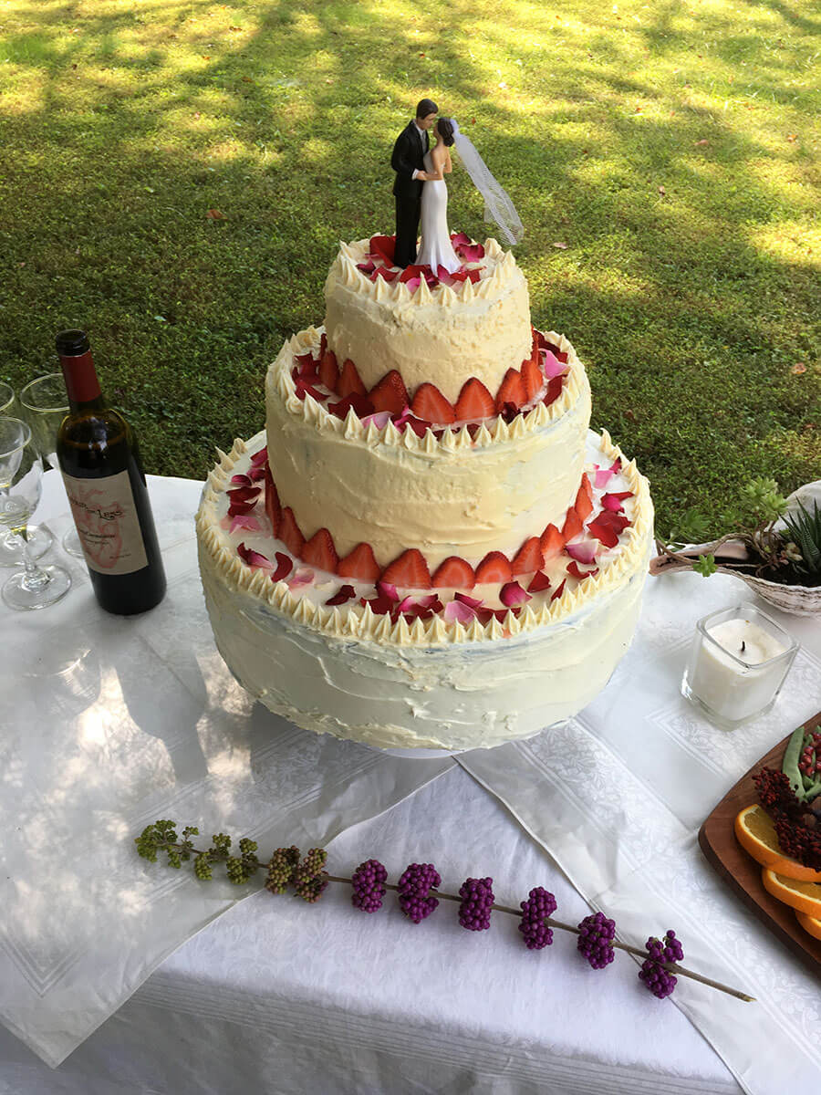 We started with a couple socially distant, outdoor brainstorming sessions and a vision started to take shape. We handled every aspect ourselves: Gabe found amazing props and costumes, we created a cardboard 3 tier cake and frosted it to look real, we built a wedding arch from bamboo, hung string lights, made bouquets, created our own wine labels, wrapped empty boxes for wedding gifts, created fliers and rented 50 chairs.