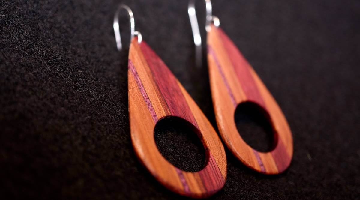 These hand made earrings are based off of an avocado form and are made of various domestic and exotic woods. None of them have been colored or stained in any way. All the colors are natural. I have always been blown away by the colors that occur naturally in different woods and I love how working with wood is far more organic than other materials like metal. You need to respect wood as a material differently and see what it will allow. Each piece differs in grain pattern and may warp or shift or crack but often paying attention to those “imperfections” gives me an opportunity to create something more beautiful. I have worked with wood since i was a little boy and always find myself coming back to it. I love creating wearable art and trying to accent the beautify of the human form by creating a piece that follows the curve of a cheek or works in harmony with the face to create a synergistic relationship! Once completed I sprayed these earrings with a satin clear coat to protect the wood from wear. Since each is hand made every earring will vary slightly in shape and wood color. There may be grain marks, or sanding lines visible in some earrings.