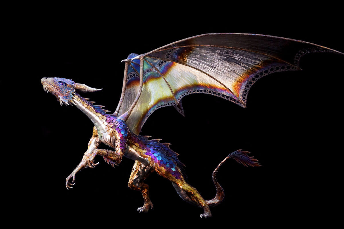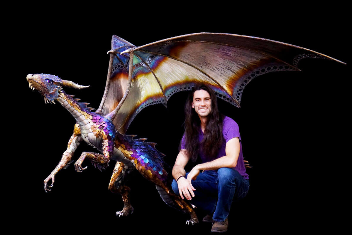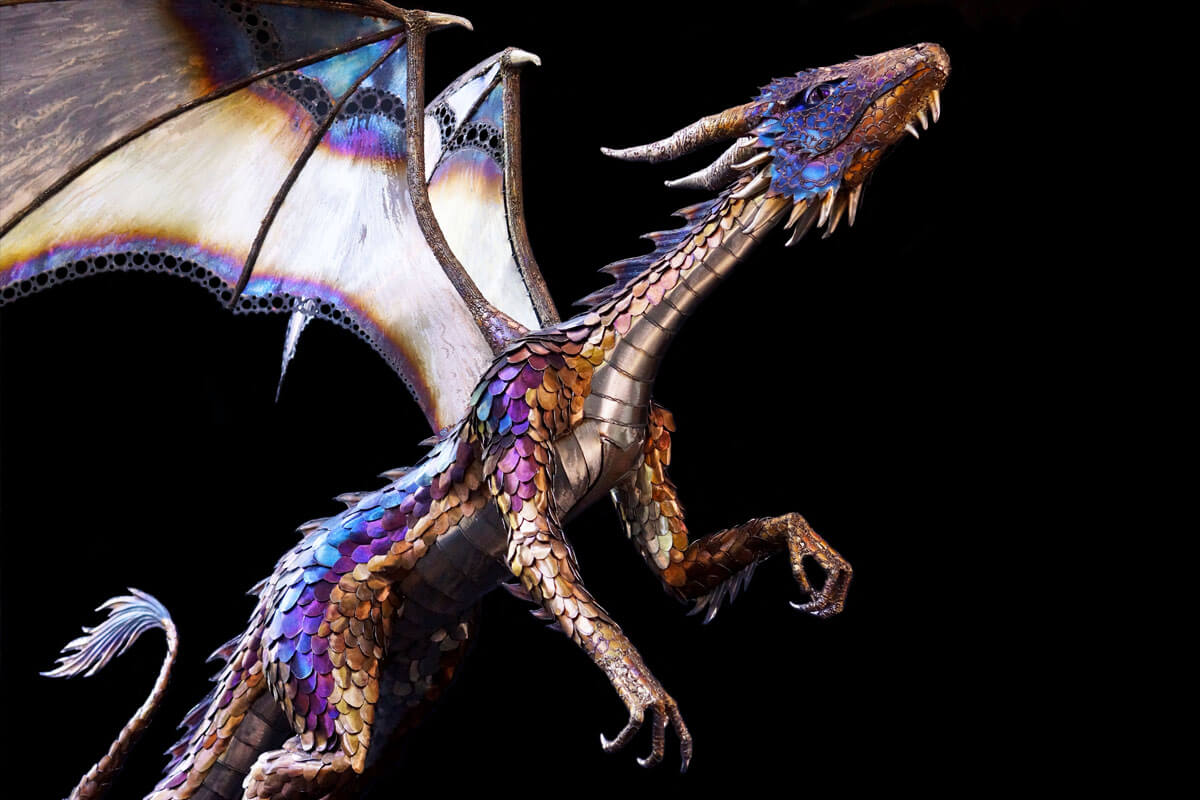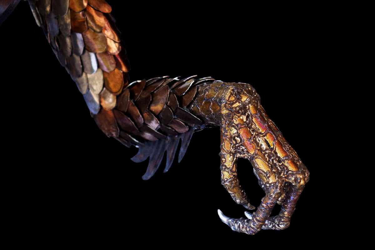 They are magical powerful mythical animals and I was born during the year of the dragon in the Chinese zodiac. I have always wanted to get into large scale public art and this is the first piece I feel fits into that category and hopefully it can help open some doors for future opportunities! This dragon is by far the most challenging, intricate, detailed piece I have made to date standing 5 feet tall with a 9 foot wingspan and covered with 1583 individual scales and 49 chest and neck plates. I started by looking at reference photos including game of thrones dragons but they are the types of dragons where the wings are connected to the front arms and I wanted the wings to be separate. I had a clear image of what I wanted it to look like but couldn't find the appropriate reference photos so I decided to contact my good friend Konstantin Kahl who is an incredibly talented illustrator. He created some beautiful sketches that really helped me wrap my mind around the movement and fluidity of this creature. I then created a skeleton using 84 linear feet of 1/8 inch rod and added a strong internal structure within that made up of 37 linear feet of tubing ranging from 3/8" thick to 2" thick. I then created the hands, feet, head, wings and fins and over 1600 individual scales. This was a long challenging process but I am incredibly happy with how she turned out.
