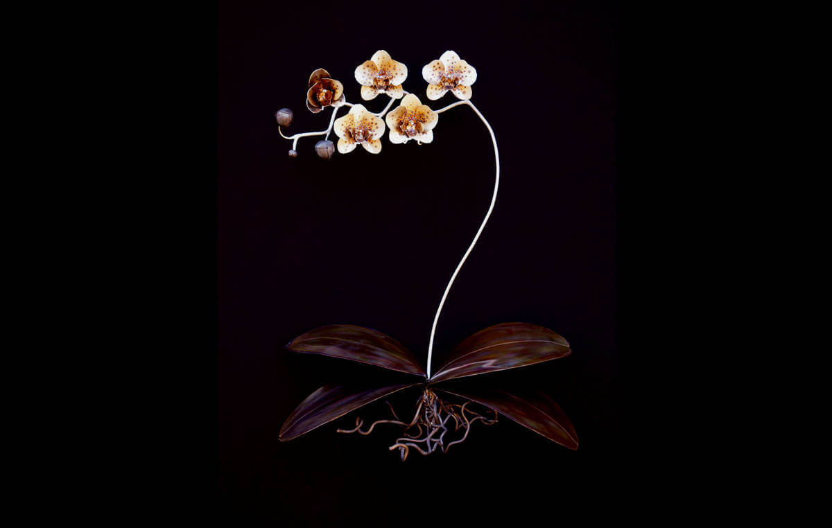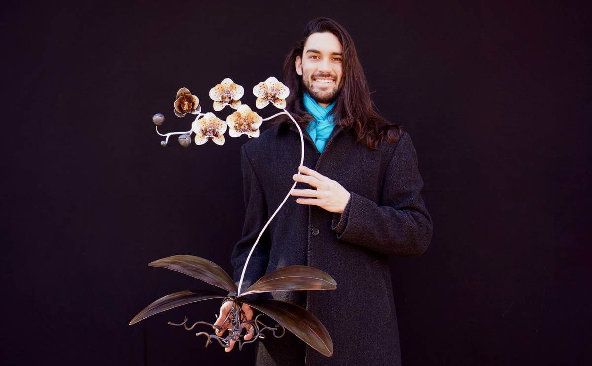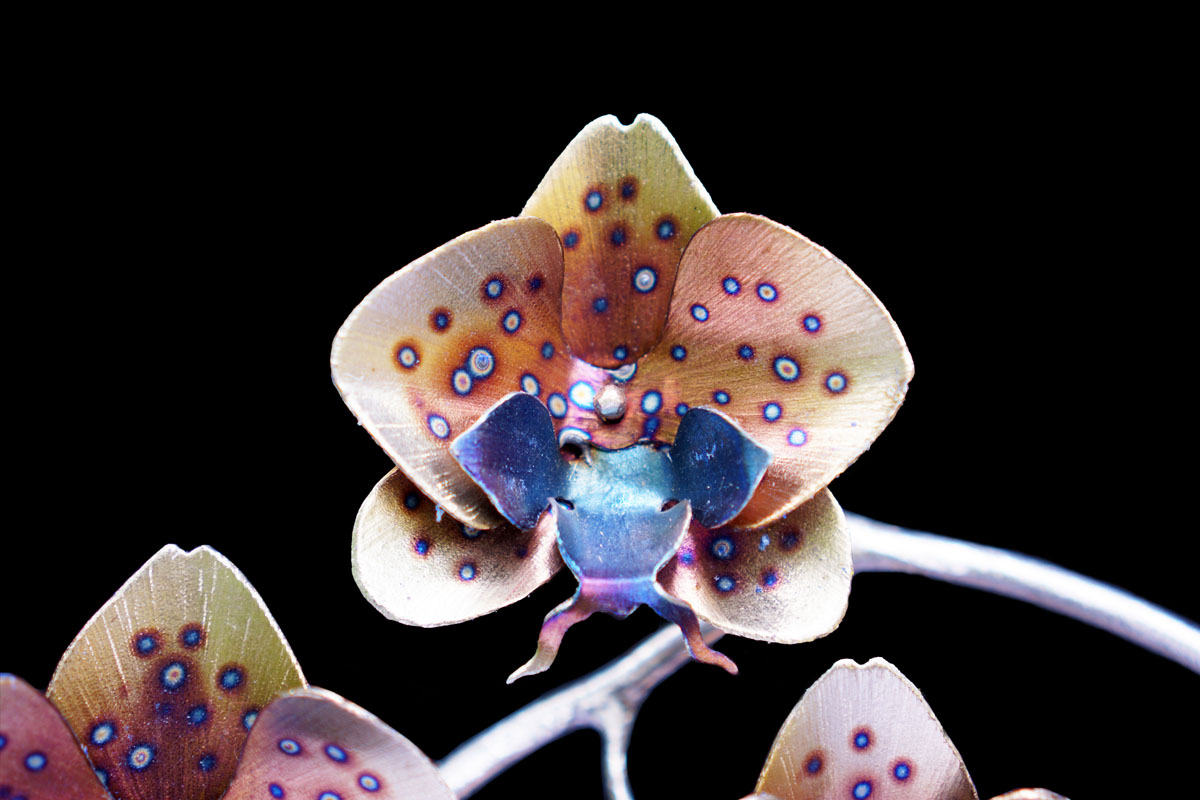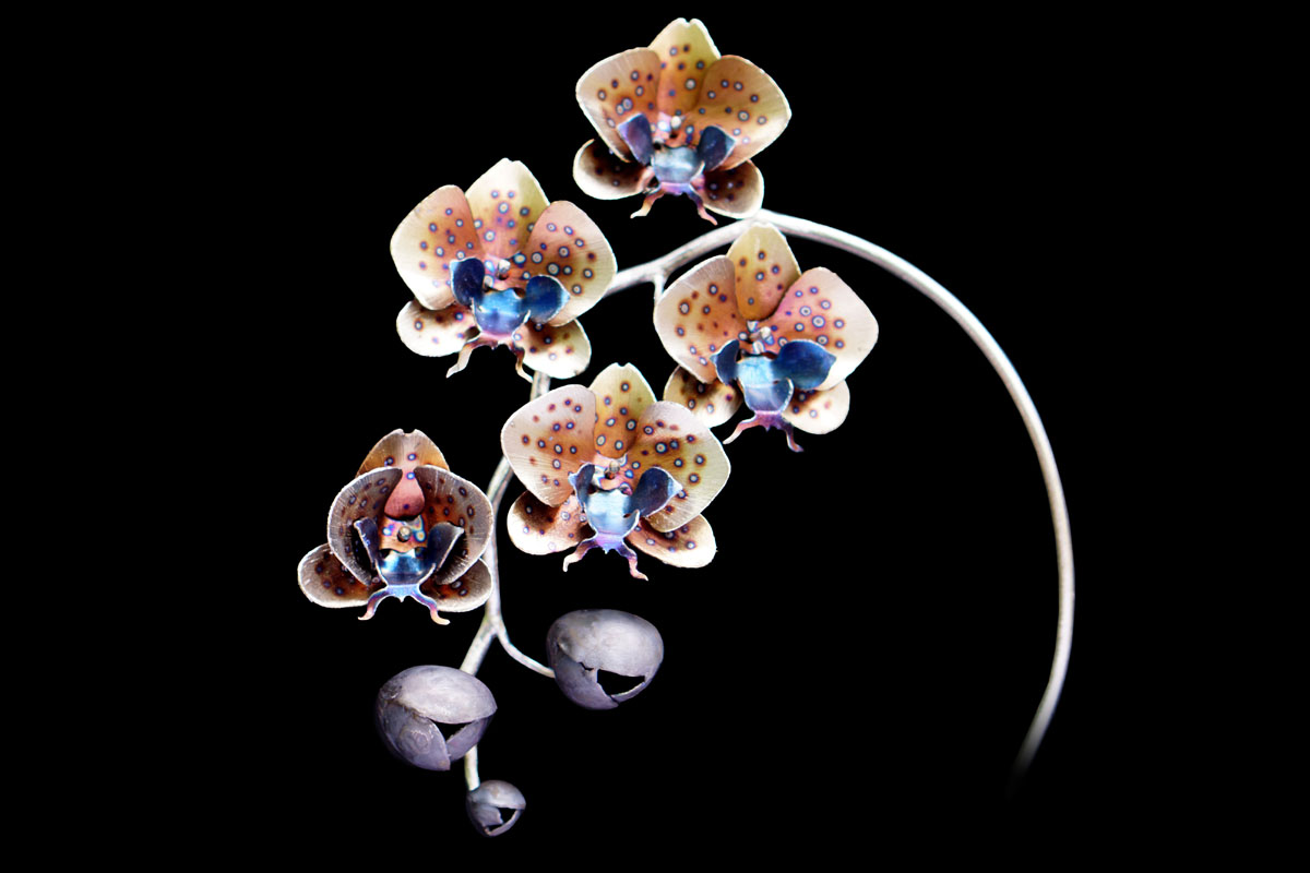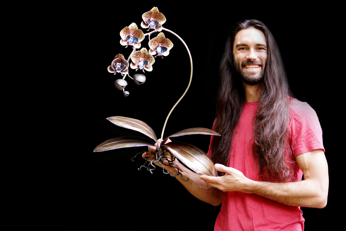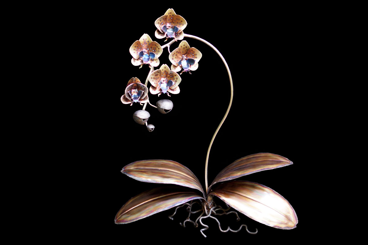 Orchids are a treasure trove for an artist as there are over 25,000 documented species! Meaning there is always a new flower to inspire you! They have bilateral symmetry similar to the human face that creates a unique balance that is rarely found in flowers. Orchids have adapted to mimic insects in order to be pollinated and even vanilla is a type of orchid! If you want to learn more about this amazing plant check out the stuff you should know podcast or article! Metal seemed like the perfect medium to create one of these plants as it can mimic the glow that seems inherent in orchid flowers. And it is strong enough to hold up all those flowers on one stem without tiny hair clips and a crutch!