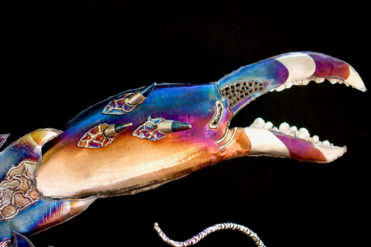 It was a pleasure bringing this exquisite creature to life. A unique challenge to this sculpture was its jet black portions. Black is a color that doesn’t come easily to stainless. I decided to burn holes and back those holes with darker metal to create texture while achieving the closest thing I could to true black. And since that first crab I have redesigned it and have been thrilled to see a lot of interest in this piece from a lot of folks with the cancer zodiac sign!