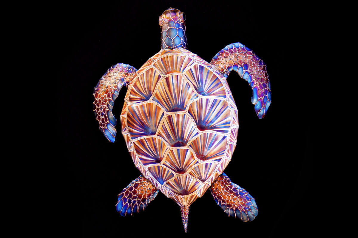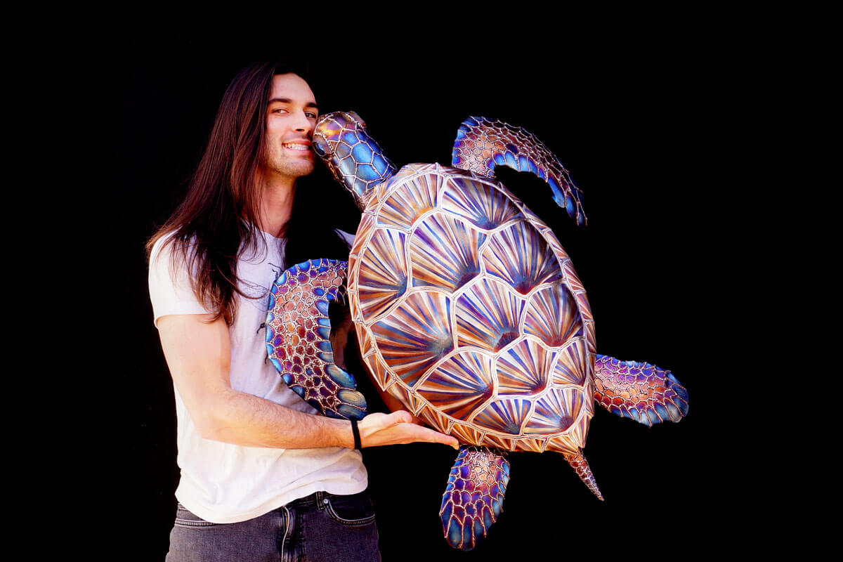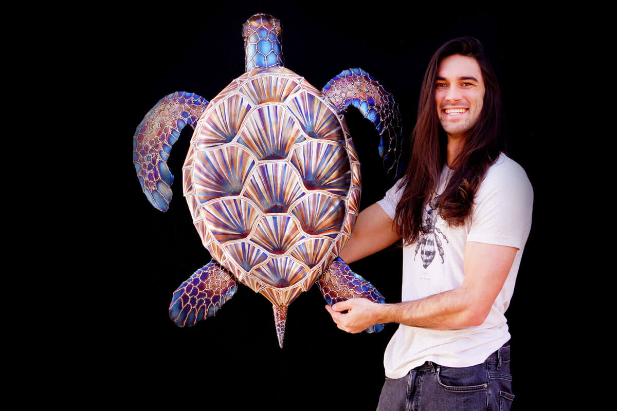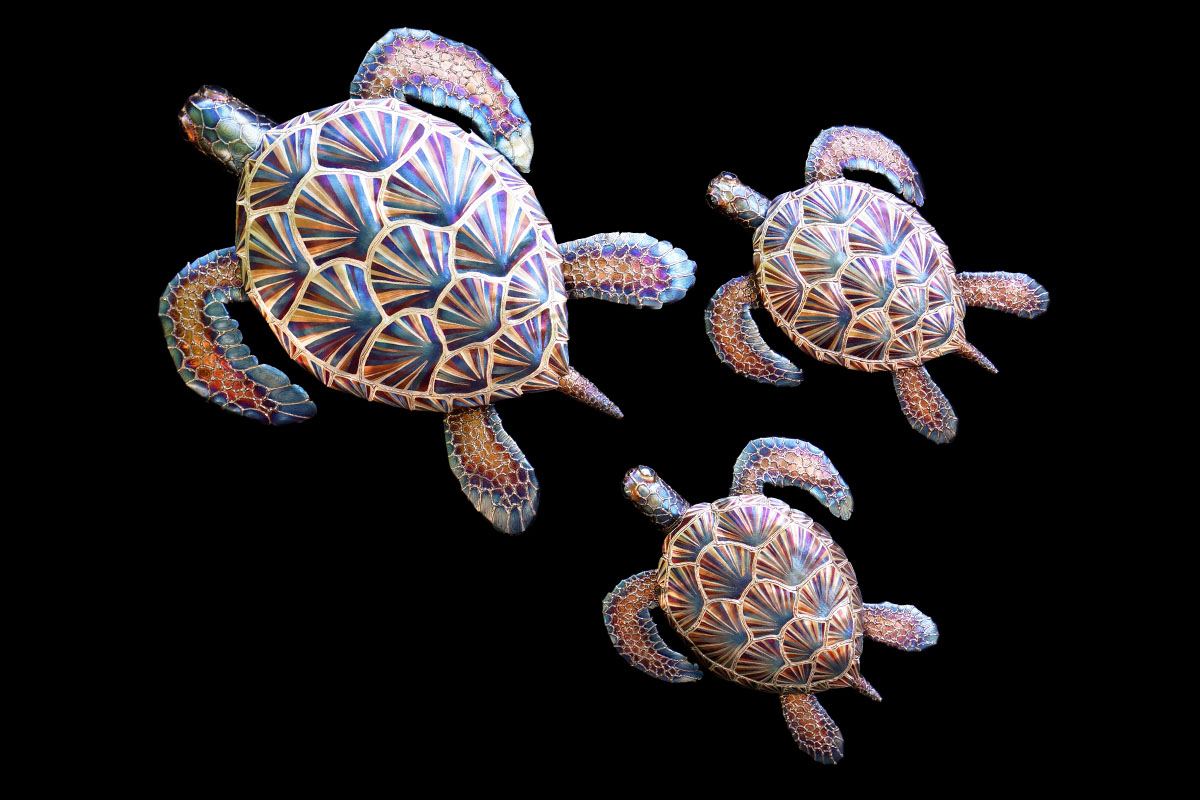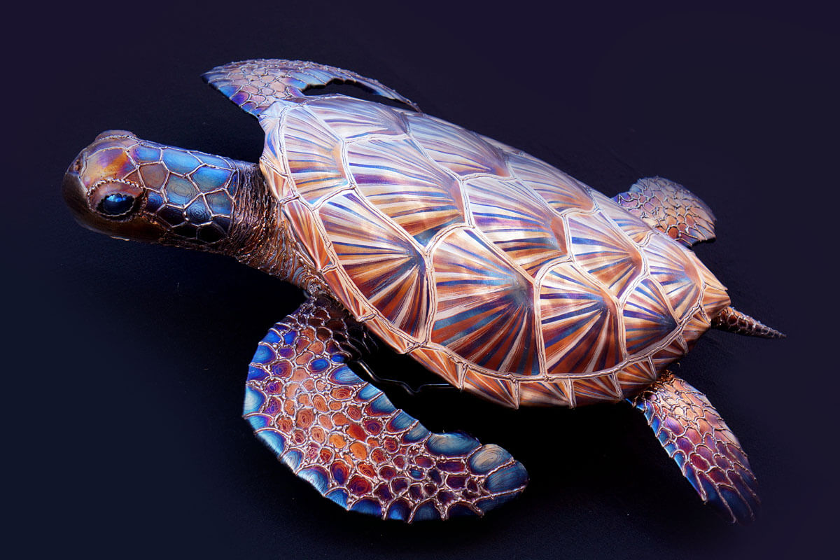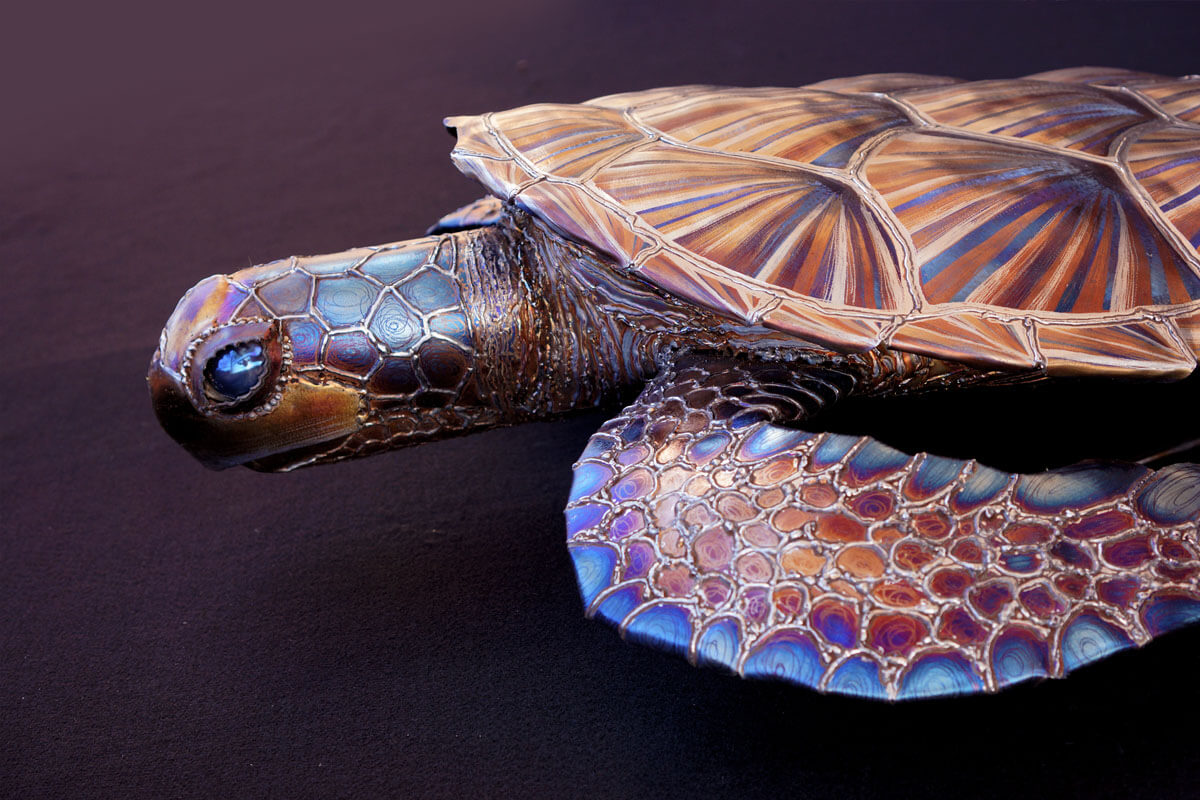 Meet Sylvia the stainless sea turtle! I find sea turtles to be incredibly beautiful kind creatures and it has been on the top of my list of things to create for a while. Luckily I was approached by a dear friend to make a Christmas gift for his wife and after speaking for a while about what she may like we settle on a sea turtle. Later I was asked to make a smaller version by multiple galleries and those can be seen below!