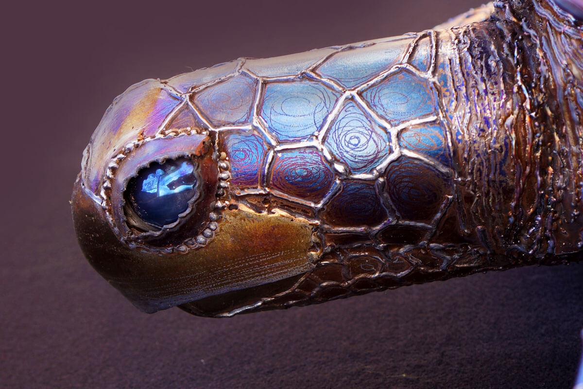I was very excited to have the opportunity to create one especially since it was for someone I care about! The shell was my favorite part to create. I colored it blue first and then went back and forth between grinding and coloring to create layered colors to create depth and have it really pop! I then ground the final silver highlights to give it that extra shine! The most difficult part was creating the head and face. Making a 3 dimensional head that was viewable from all sides with compound curves was a fun challenge. The only way i could find to hide my welds was to make them part of the design aesthetic. I also had to sneak a spoon in there to flesh out part of it. Can you find the spoon? Overall I love how this piece turned out and I am happy to know she is in a loving home!