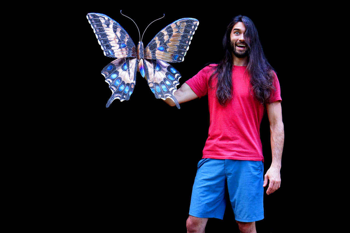 This handmade metal butterfly sculpture is wall hanging, made entirely of stainless steel, colored using only heat patinas and is completely safe to be kept outdoors.
