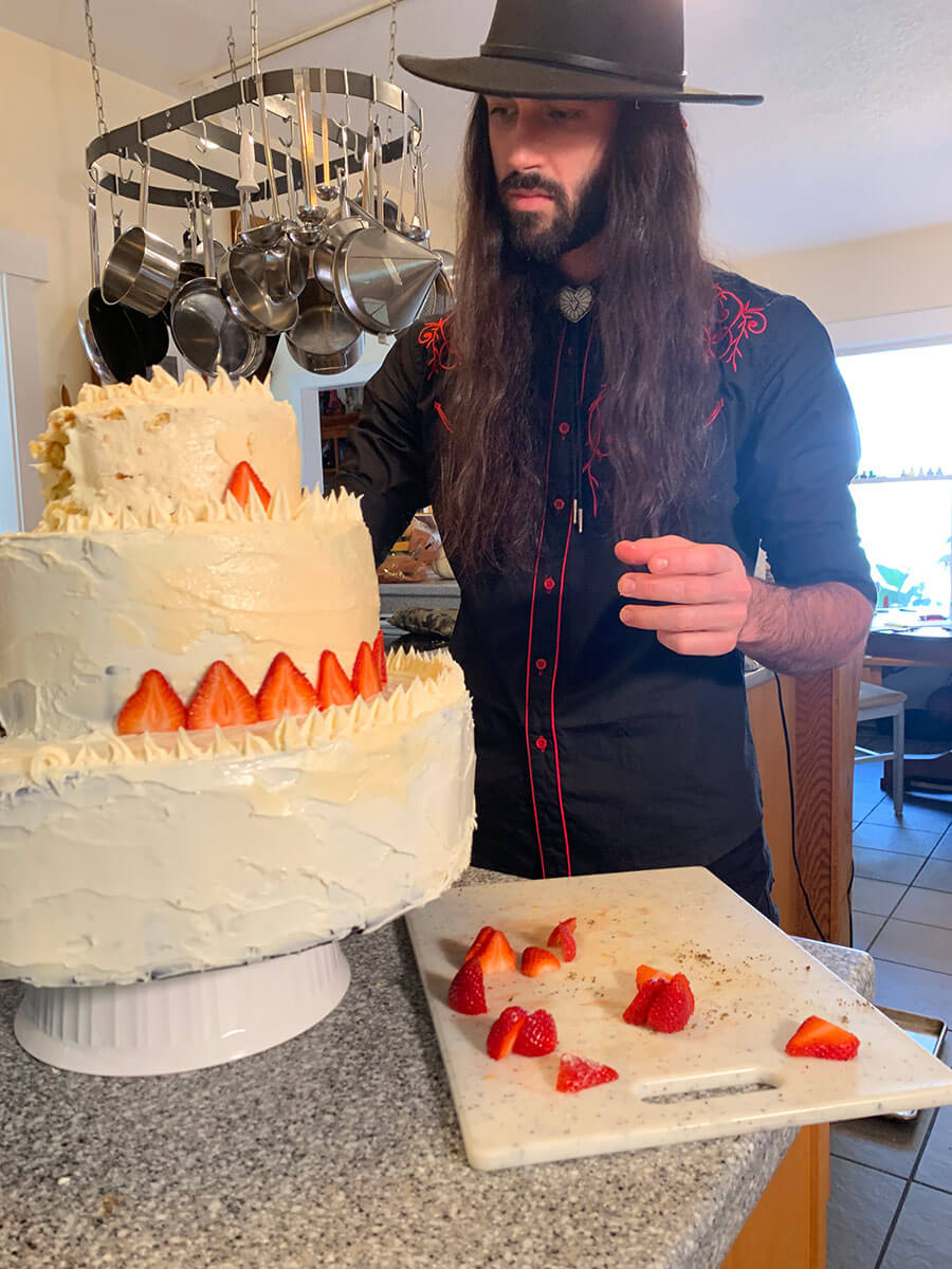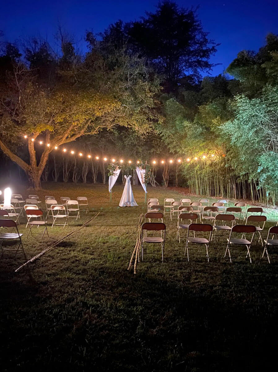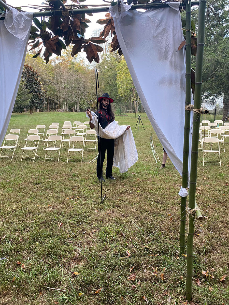 We started with a couple socially distant, outdoor brainstorming sessions and a vision started to take shape. We handled every aspect ourselves: Gabe found amazing props and costumes, we created a cardboard 3 tier cake and frosted it to look real, we built a wedding arch from bamboo, hung string lights, made bouquets, created our own wine labels, wrapped empty boxes for wedding gifts, created fliers and rented 50 chairs.