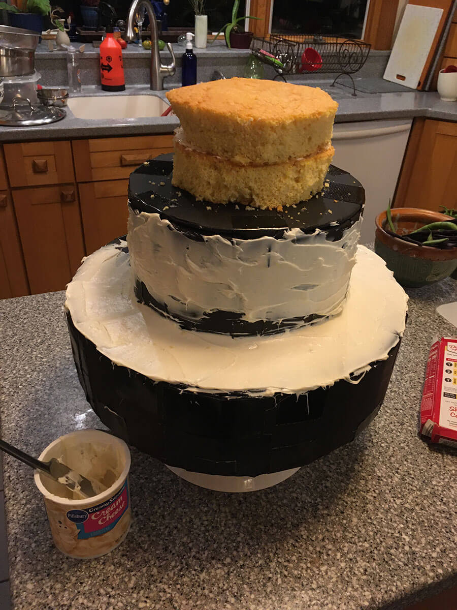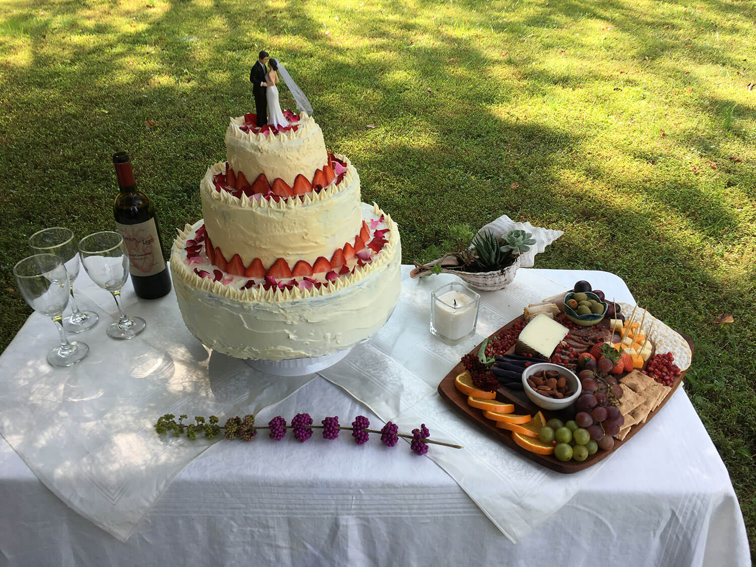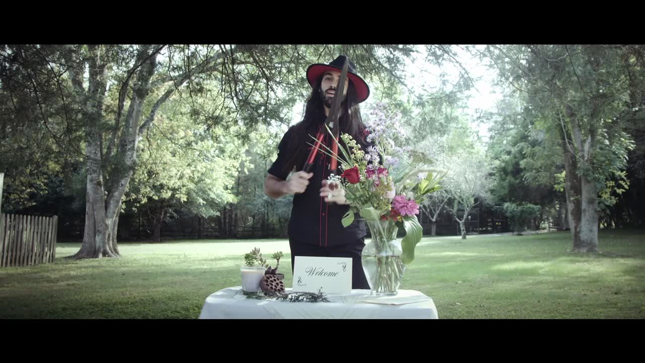 We started with a couple socially distant, outdoor brainstorming sessions and a vision started to take shape. We handled every aspect ourselves: Gabe found amazing props and costumes, we created a cardboard 3 tier cake and frosted it to look real, we built a wedding arch from bamboo, hung string lights, made bouquets, created our own wine labels, wrapped empty boxes for wedding gifts, created fliers and rented 50 chairs.