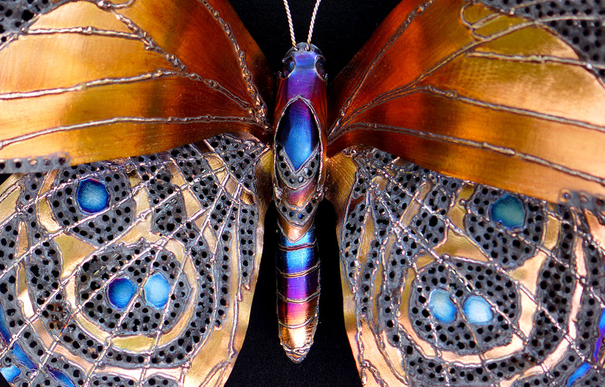 This handmade metal butterfly sculpture is wall hanging, made entirely of stainless steel, colored using only heat patinas and is safe to be kept outdoors!
