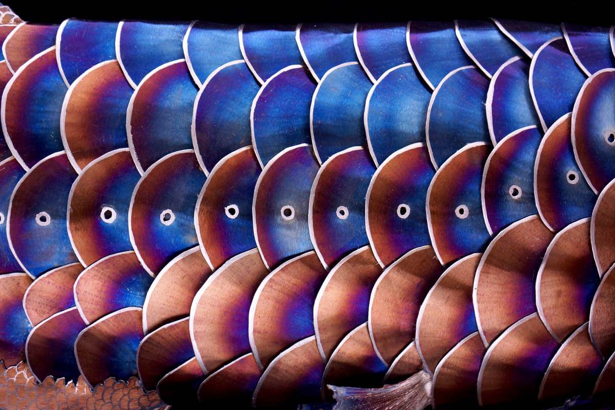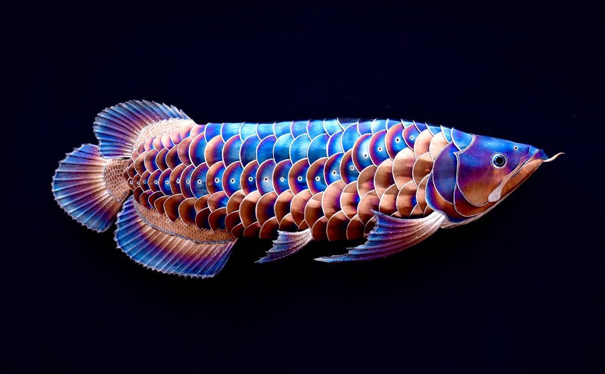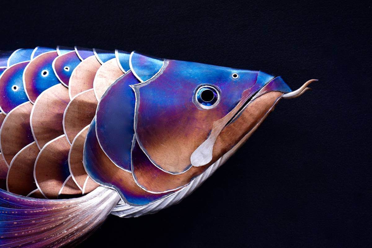 This handmade arowana fish sculpture is wall hanging, made entirely of stainless steel, colored using only heat patinas and is completely safe to be kept outdoors!