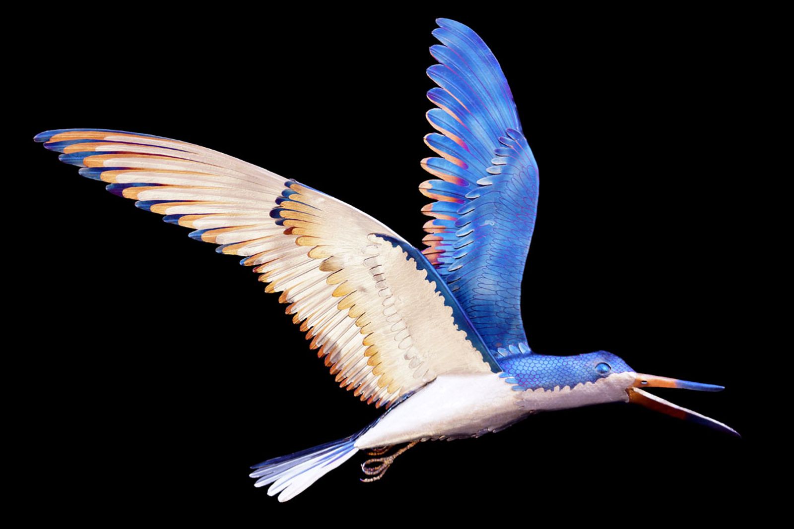 Since black is not a color I can get with heat patinas I decided to make the dark areas with blues and purples instead. And then I ground in the feather details, colored the golds as they are a colder color, and finally ground in all the silver details to bring this bird sculpture to life.