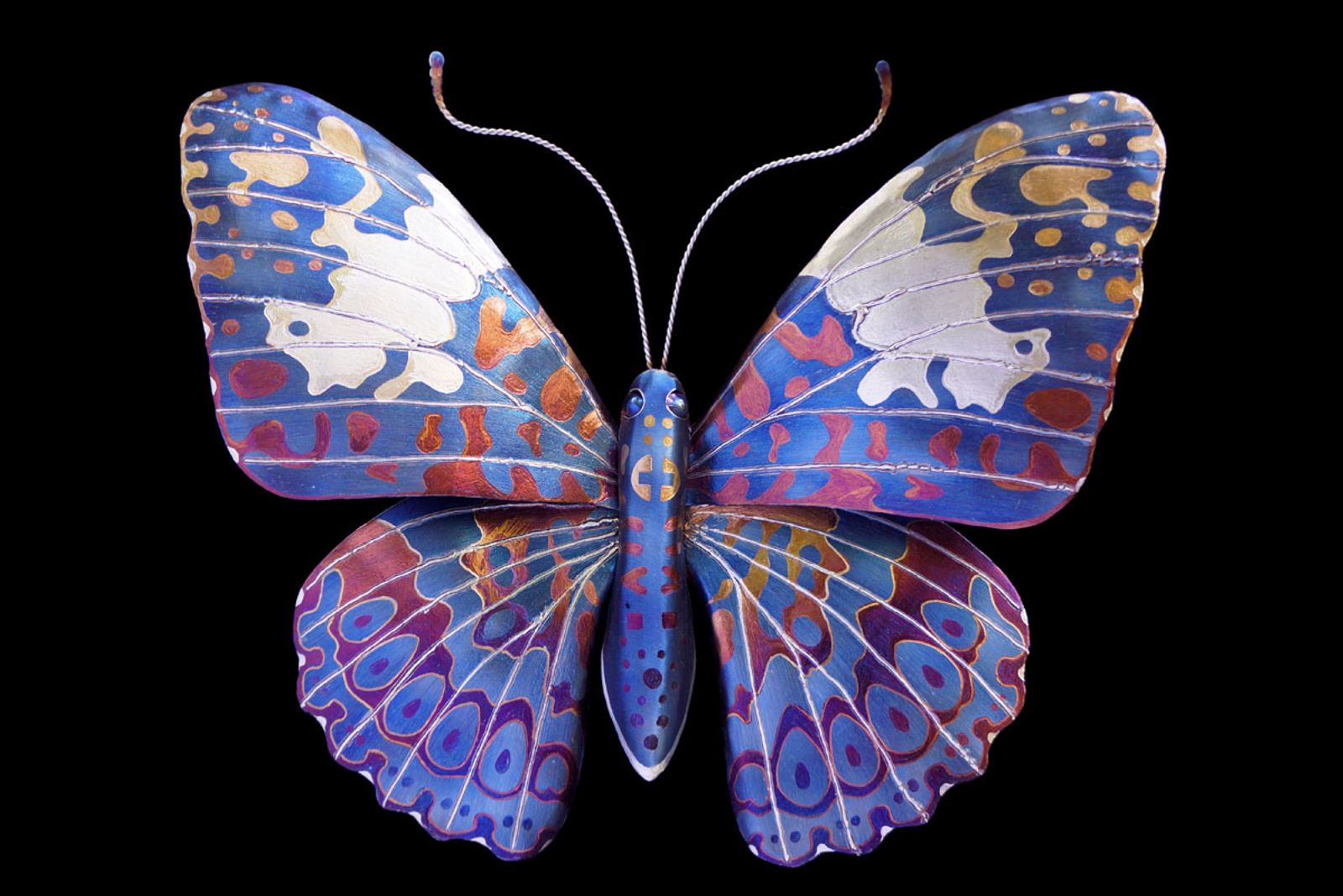 This Blue Cracker butterfly sculpture is wall hanging or able to be mounted on a garden stake, made entirely of stainless steel, colored using only heat patinas, and is safe to be kept outdoors!