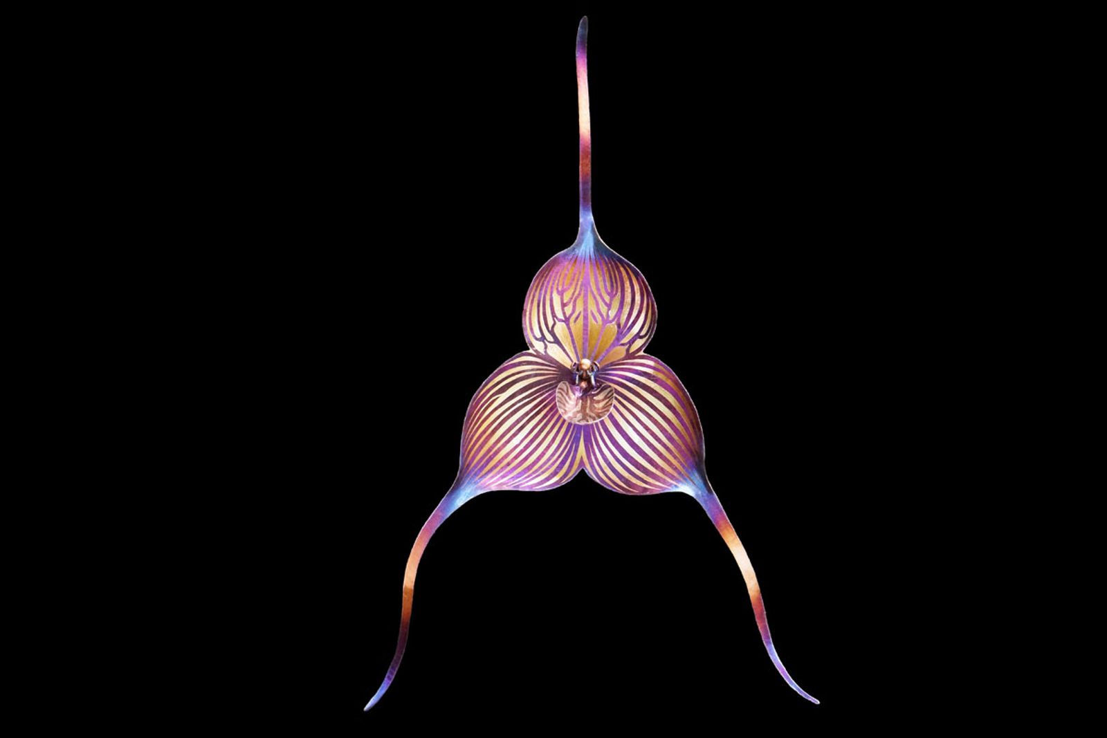This Dracula Orchid sculpture is wall hanging, made entirely of stainless steel, colored using only heat patinas, and is safe to be kept outdoors!