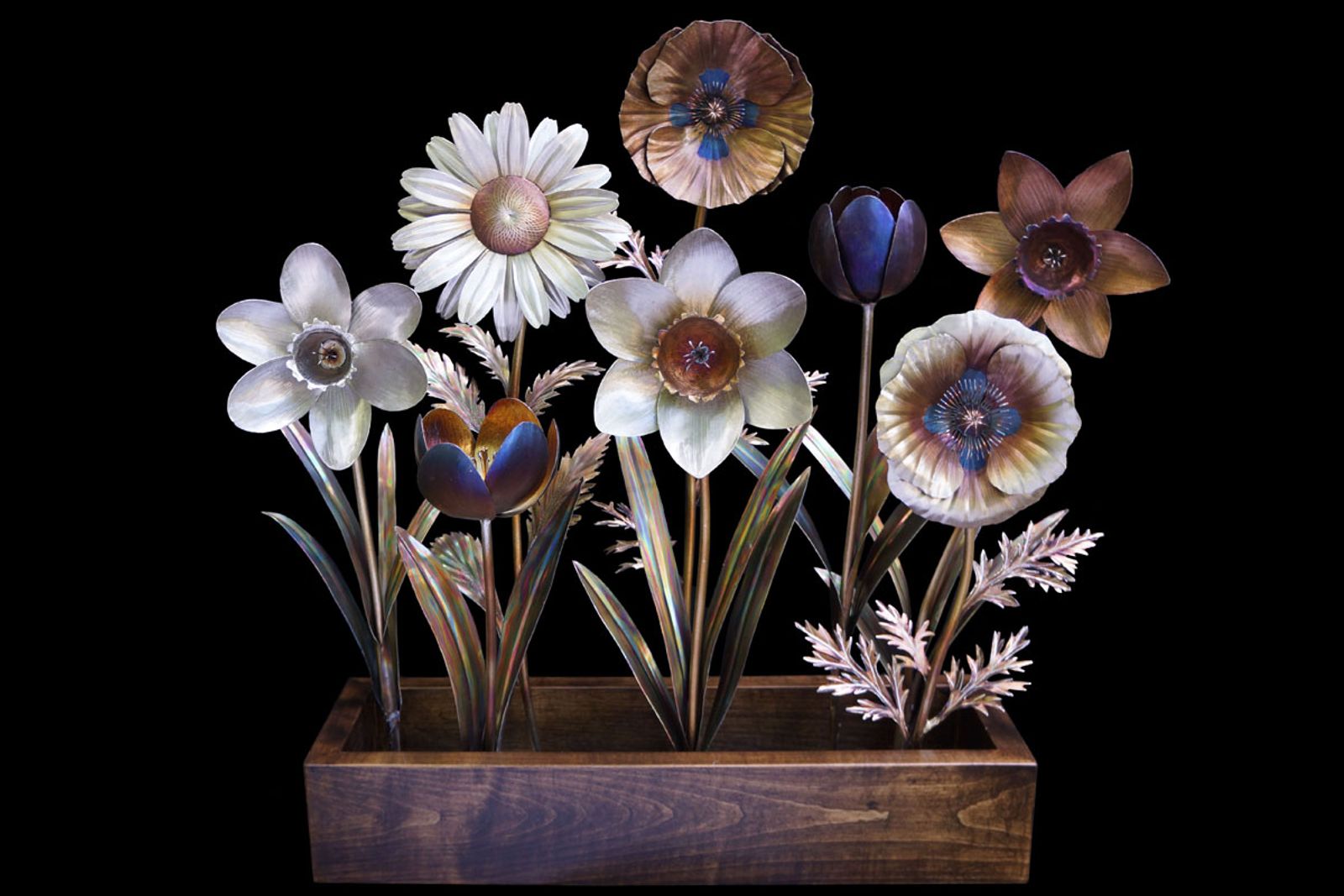 The handmade soft maple planter box was stained with a deep black walnut finish, grounding the composition and giving the illusion that the flowers were truly sprouting from soil. Hidden within the box are the bases of each bloom, their stems disappearing into wood just like a living planter.