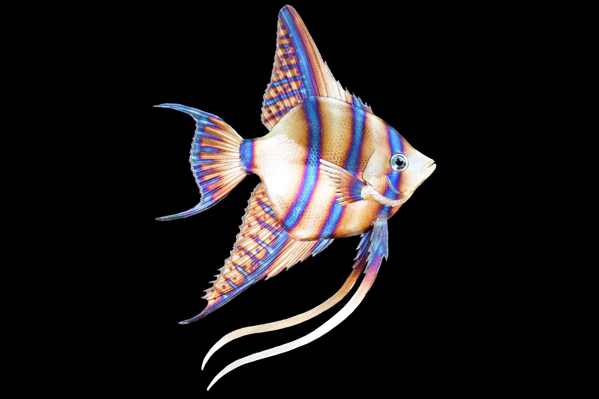 This freshwater angelfish is a handmade wall hanging metal sculpture made entirely of stainless steel, colored using only heat patinas and is completely safe to be kept outdoors.