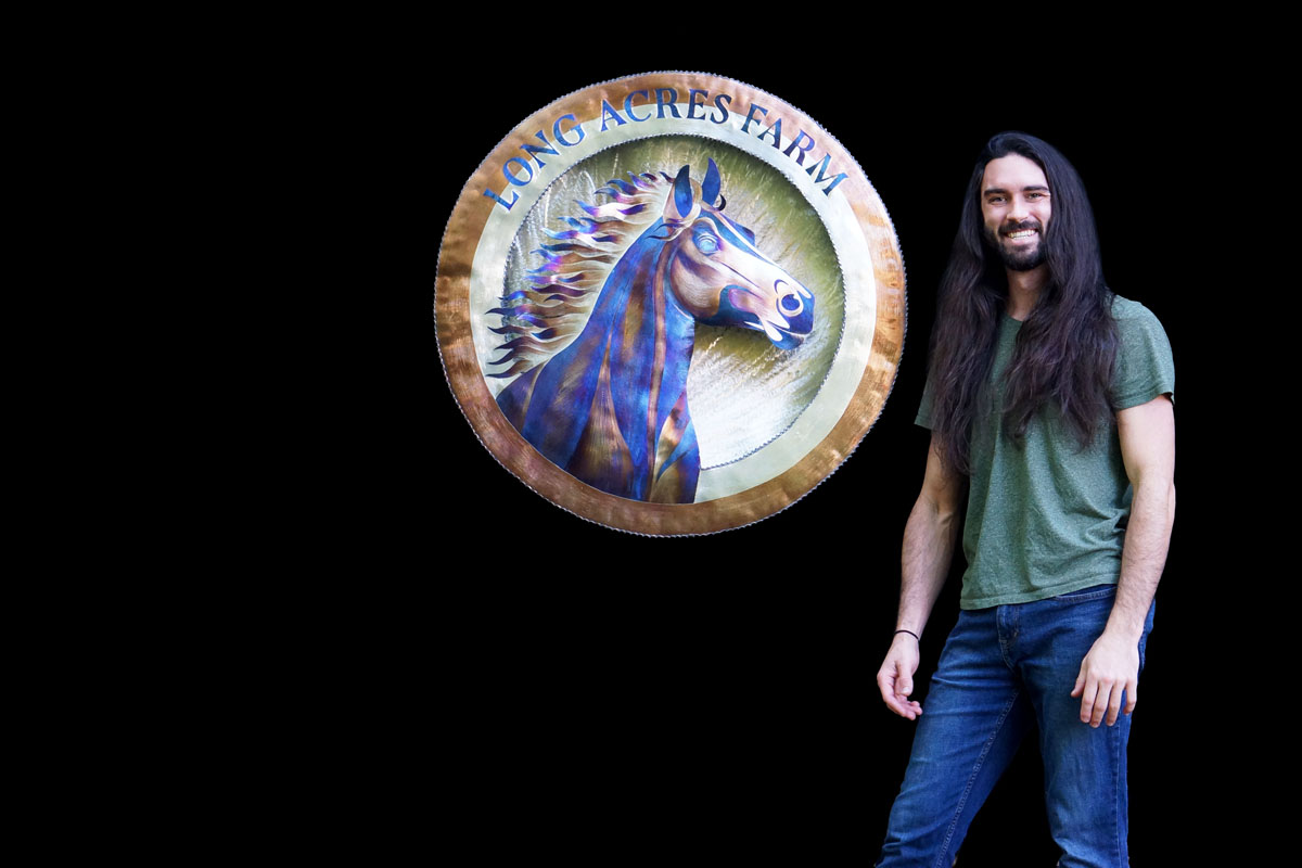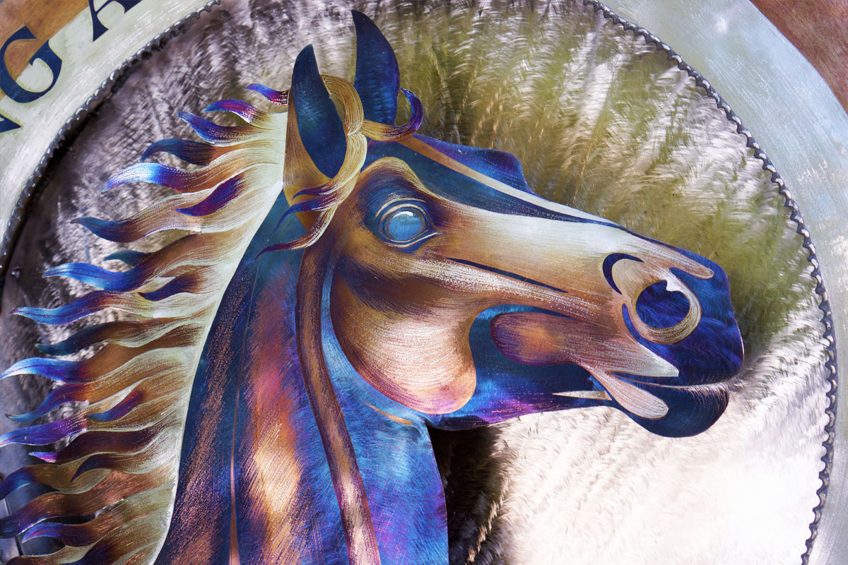 This metal horse sign sculpture is wall hanging, made entirely of stainless steel, colored using only heat patinas and is safe to be kept outdoors!