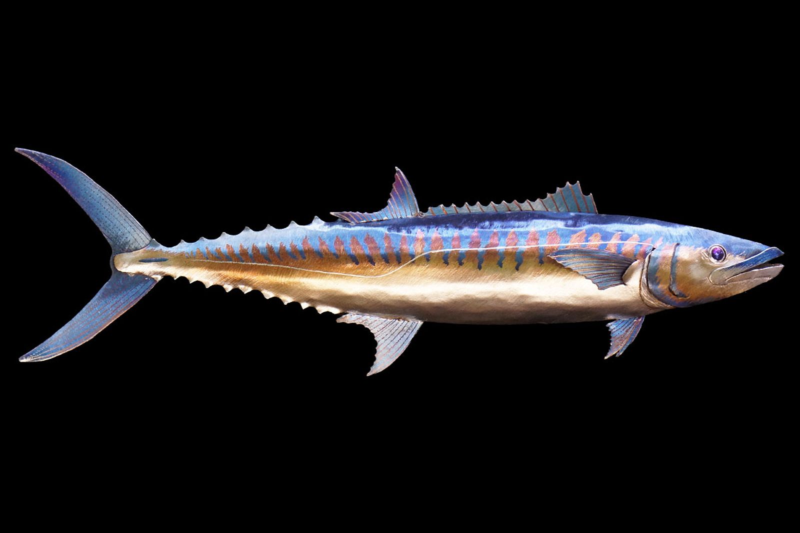 King mackerel are silver and blue with subtle striping. I wanted to bring a bit more color in while still having it feel aligned with how they look in real life. I decided to grind in those blue stripes and then add in a bit of gold and orange to have color throughout. I think it helped add balance to the overall piece. The blue was the first color down since it's the hottest heat patina, and then I ground back through to reveal the silver and carefully recolored to get those warmer gold tones. I love how such a compact metal fish sculpture can still have so much depth and detail!