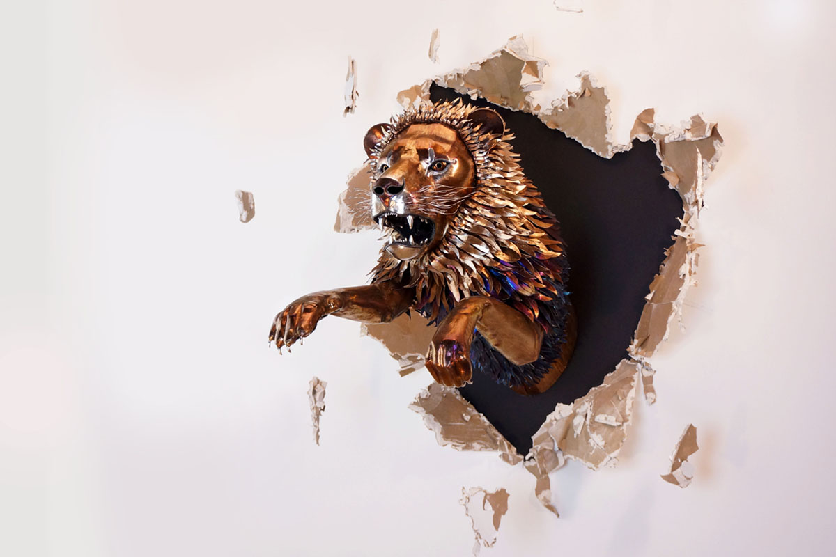 Then it was on to cutting thousands of pieces of mane hair. This was incredibly tedious but once I got them all welded on I shaped each one by hand to help them feel a bit more natural and then created the "broken" wall background to create the illusion that the lion was bursting through the wall.