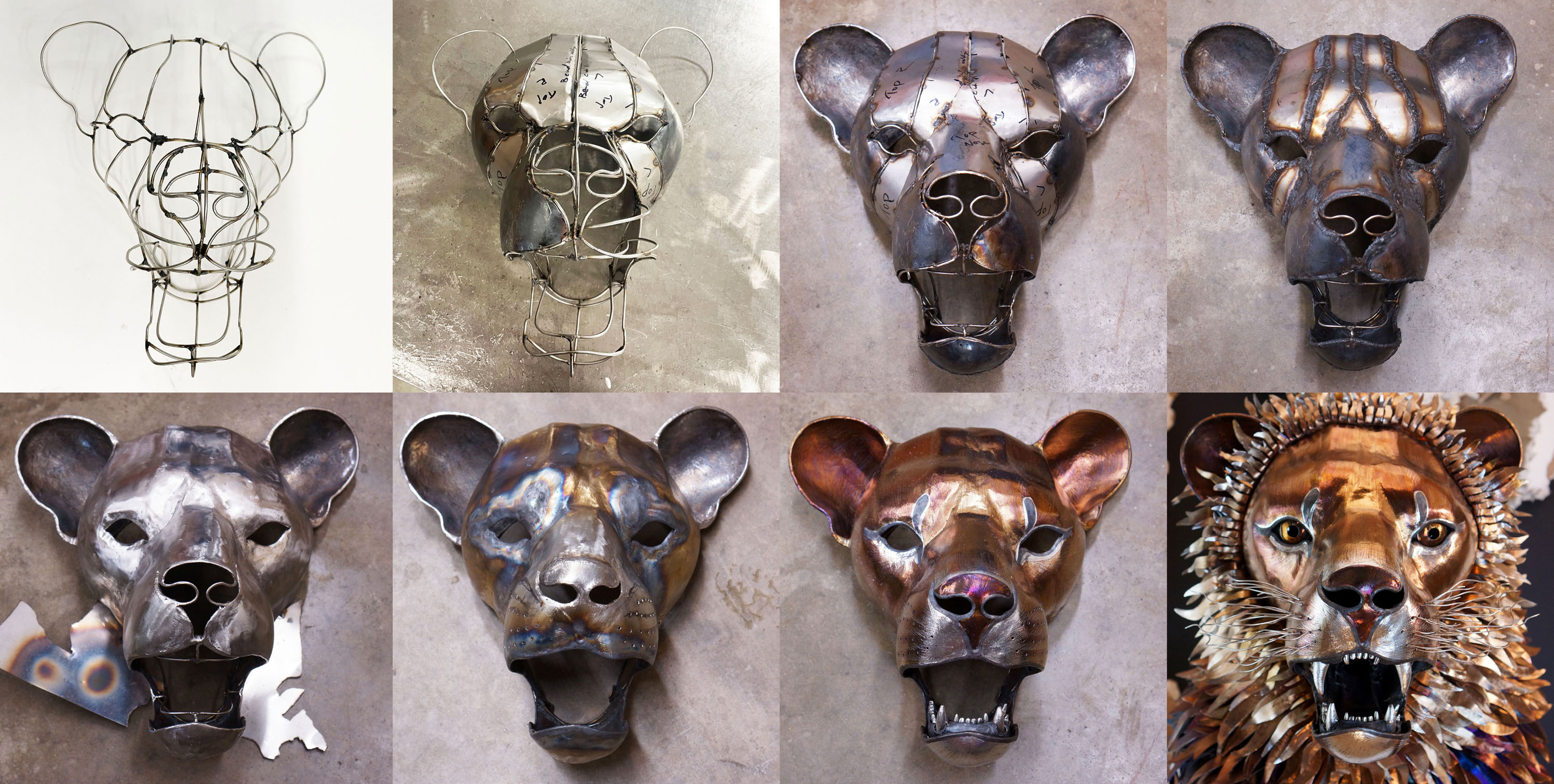 Creating the face was by far the most challenging part. I first mocked it up with 1/8" rod and then heat shaped each piece to fit perfectly in between each rod piece (photos above). Once all the spaces were filled I welded the seems thoroughly and ground them back to smooth which took a few days. Then came the challenge of coloring them. Since I color using only heat the seems between the panels were thicker because of the 1/8" rod meaning that in order to get them to be the golden color I wanted the panels on either side got far hotter and ended up blue. So I had to go back and forth between coloring and then grind off all the other color and feather it back in and repeat this process until everything was a uniform golden color. Then came eyes, gums, teeth whiskers, tongue, the roof of the mouth etc. Once the face was complete I then created an extensive internal weight bearing structure. Then it was on to the paws and arms. These were also incredibly challenging and if I'm being honest I am not super happy with how they turned out but I had to make a decision due to timeframe and I do think they worked well enough. though if I had more time or a budget for this piece I would have created the separate muscle groups for the arms to give it a lot more life! Maybe next time haha.