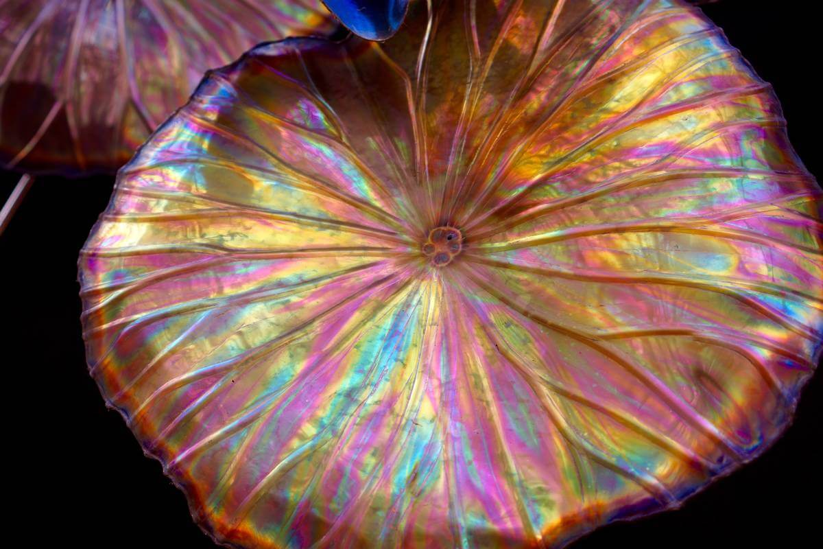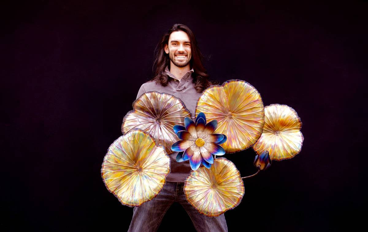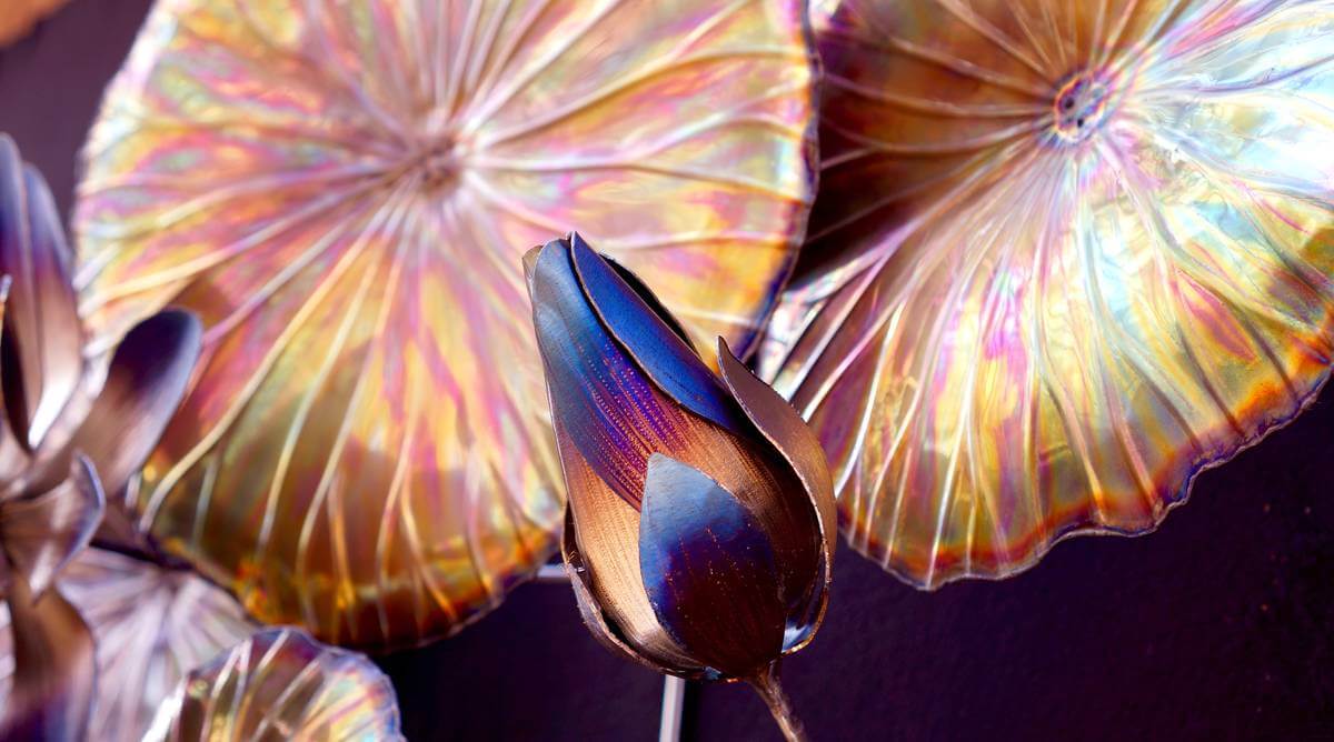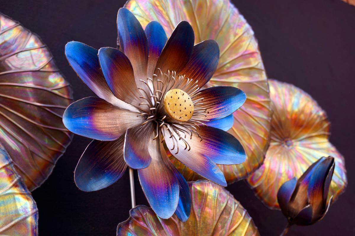 This lotus sculpture is wall hanging, made entirely out of stainless steel, colored using only heat patinas, and must be kept indoors.