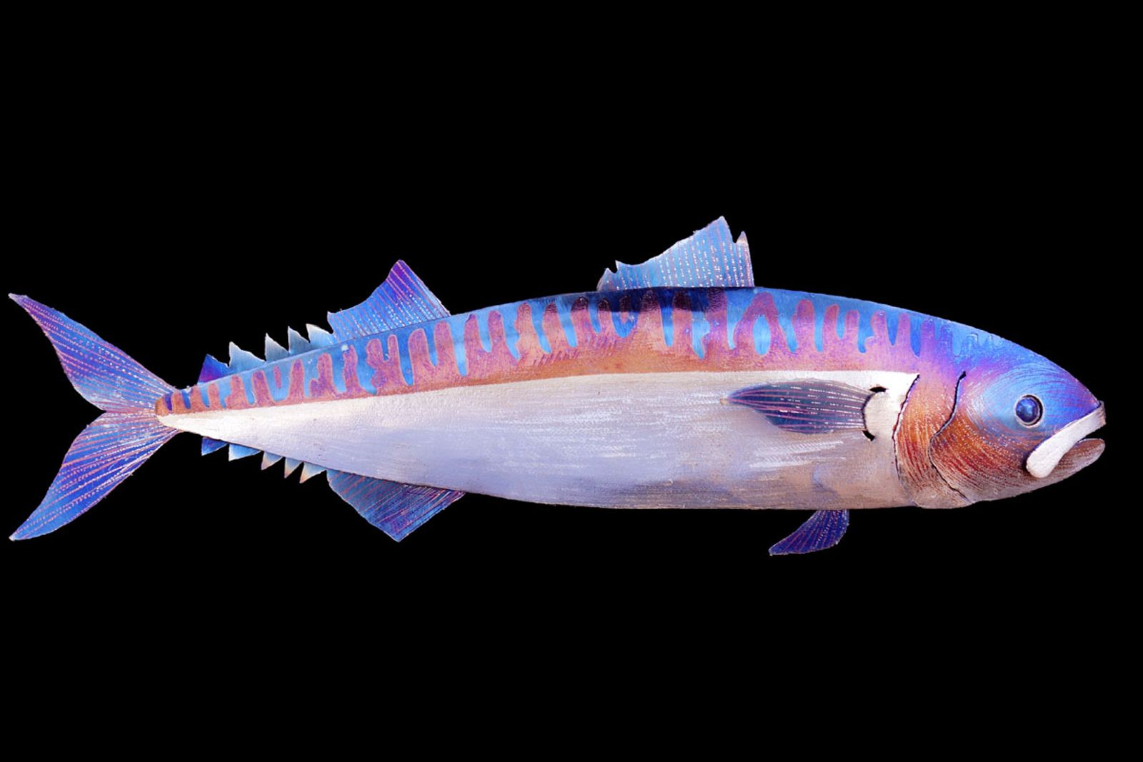 This metal mackerel sculpture is wall hanging, made entirely of stainless steel, colored using only heat patinas, and is safe to be kept outdoors!