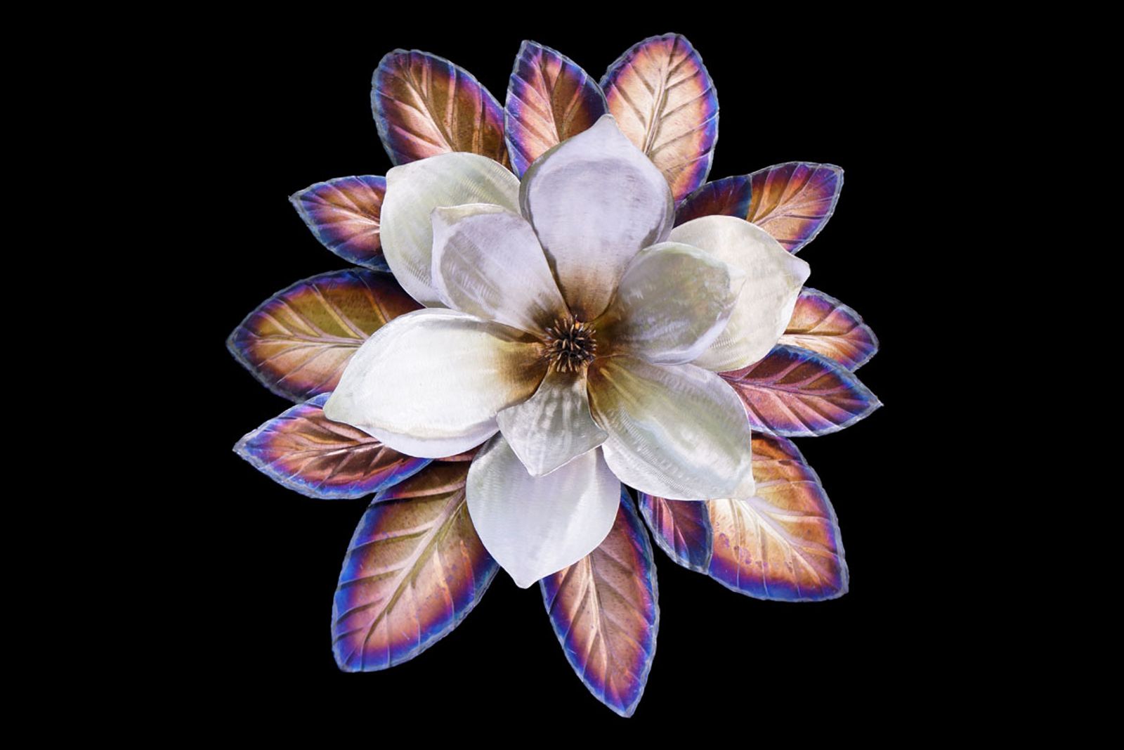 This metal magnolia sculpture is wall hanging, made entirely of stainless steel, colored using only heat patinas, and must be kept indoors!