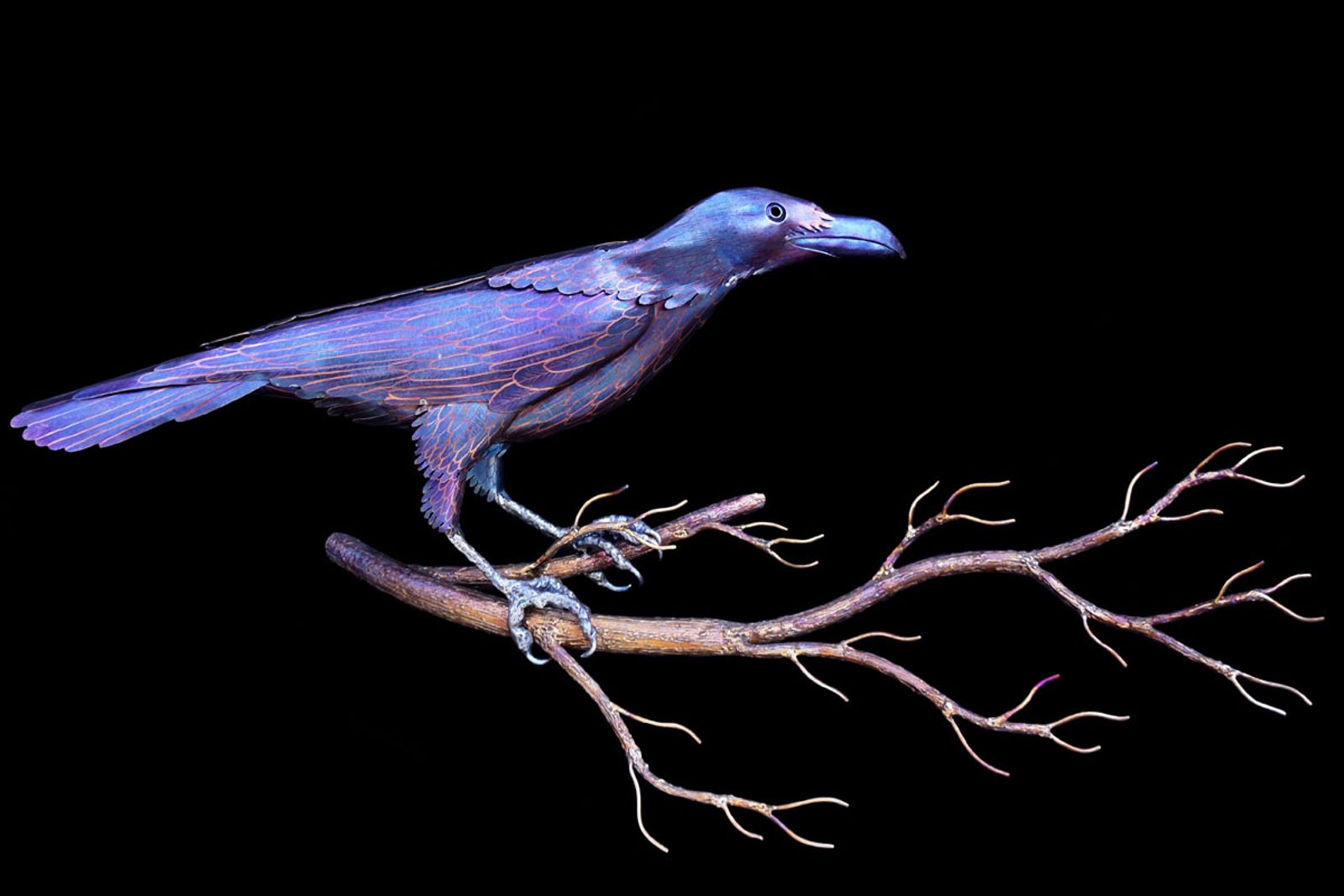 It was interesting to create a black bird with my color palette. I decided to focus on purple with some blues as crows and other black birds can iridesce to be purply blue. I then ground in all the feather detail and brought in some golds to create detail and distinction. And ultimately I felt it worked out quite well and read as a crow, not as a blue or purple bird. I wanted to make this crow sculpture with its wings folded in because for some reason I always imagine crows on a branch peering down or hopping along on the ground. But to have a crow hanging on the wall just floating there felt strange so I decided to create a branch for it to be sitting on. This allowed for a more natural wall hanging look and let the branch double as a support to hold it off the wall a bit. The dimensions above are for the whole piece branch included. The dimensions for the metal crow alone are 28" wide by 14" tall by 6" deep.