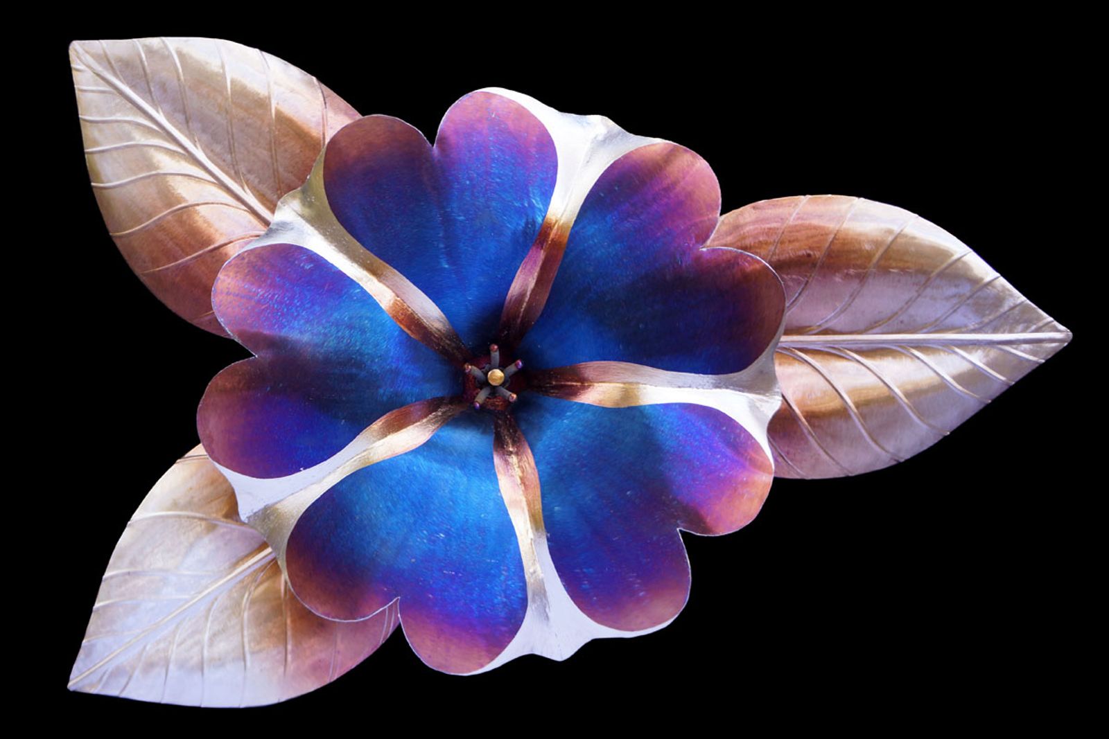 Handcrafted stainless steel petunia sculpture, colored with torch fire