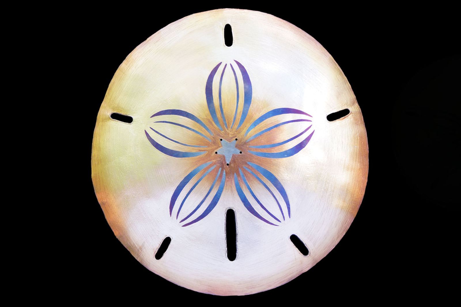 This metal sand dollar sculpture is wall hanging, made entirely of stainless steel, colored using only heat patinas, and is safe to be kept outdoors!