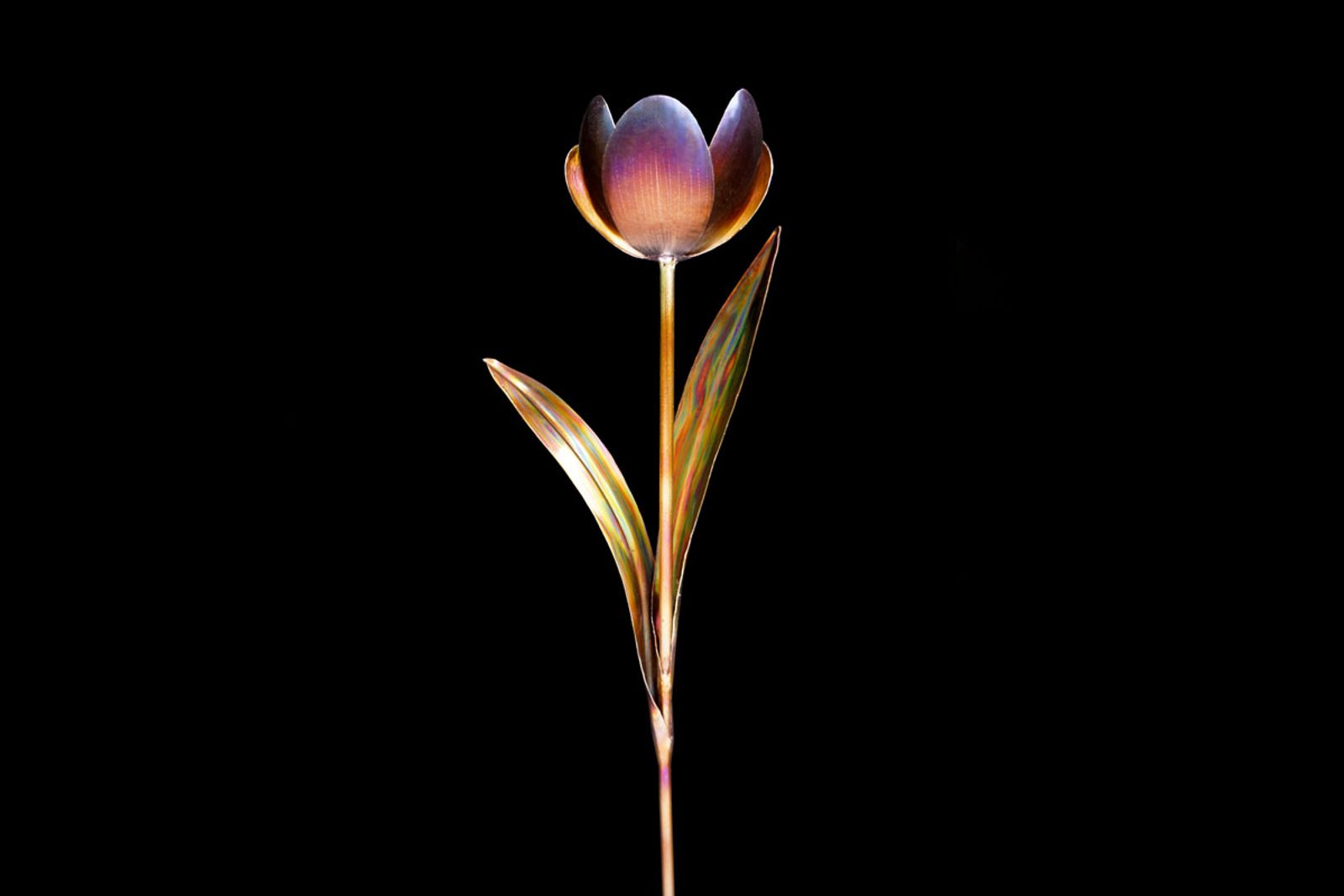 Handcrafted stainless steel tulip sculpture, colored with torch fire