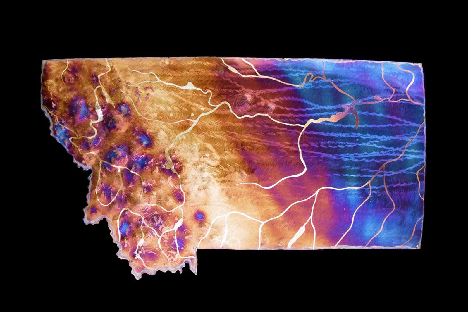 Handcrafted stainless steel montana map sculpture, colored with torch fire