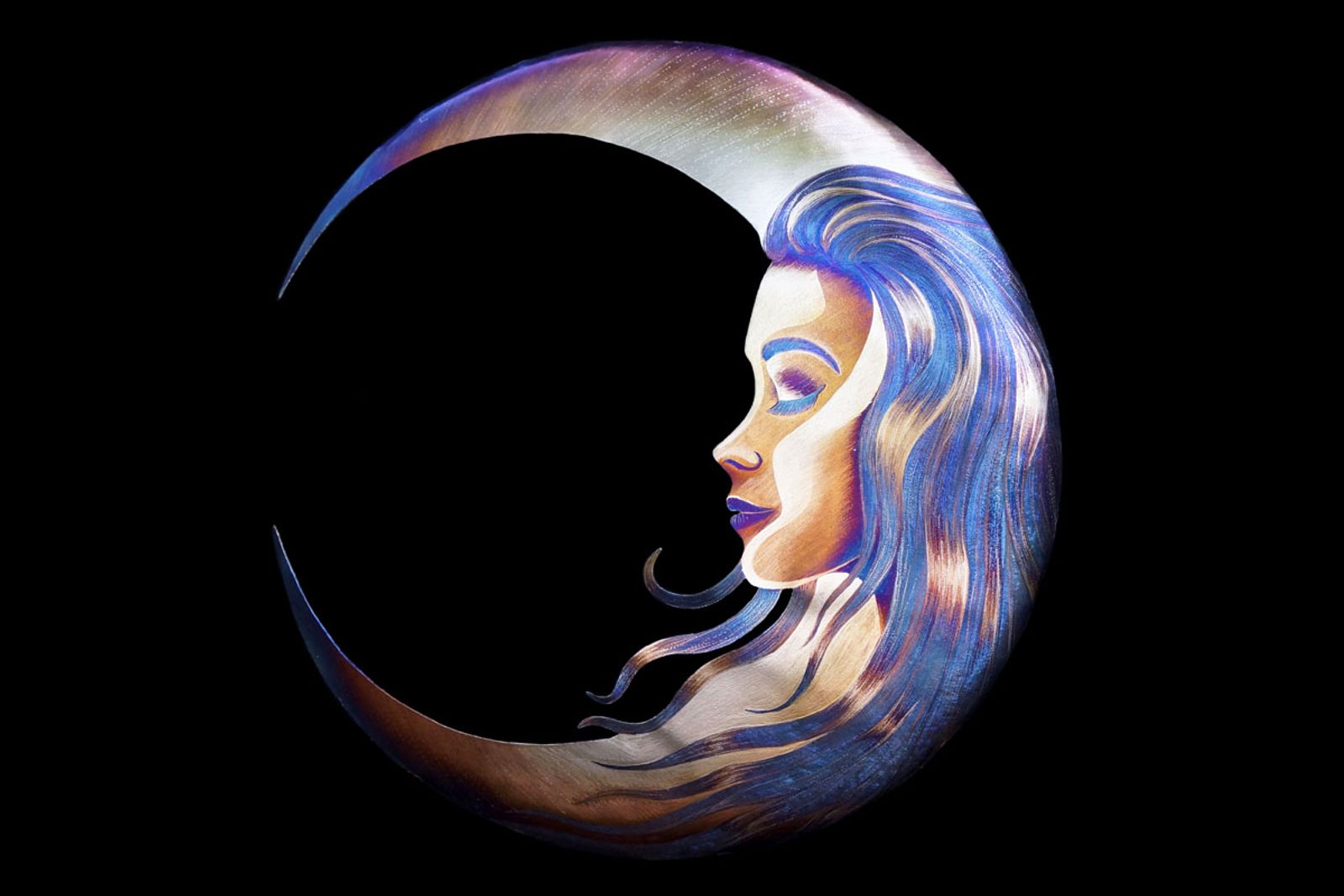 This was a very exciting idea for me! And I love having the opportunity to create something from scratch so I sat down and started drawing different takes on a woman in the moon. I didn't want it to be too simple. I wanted to create something familiar but unique. I worried it might fall into the generic "face in the moon" category but after a few sketches I found the design that felt right to me. She felt content and peaceful! So I took that design and began drawing it out of metal. This technique is one I had been recently developing and she was only the second time I had done it: I colored the whole piece blue (hottest color) then ground everything but what I wanted to remain blue away and then colored everything purple (second hottest color) and so on until finishing with the final silver highlights. It was a time consuming process but it created really beautiful depth and intricate magical moments of color interaction. I loved it! I particularly liked how the wavy hair came out in this one!