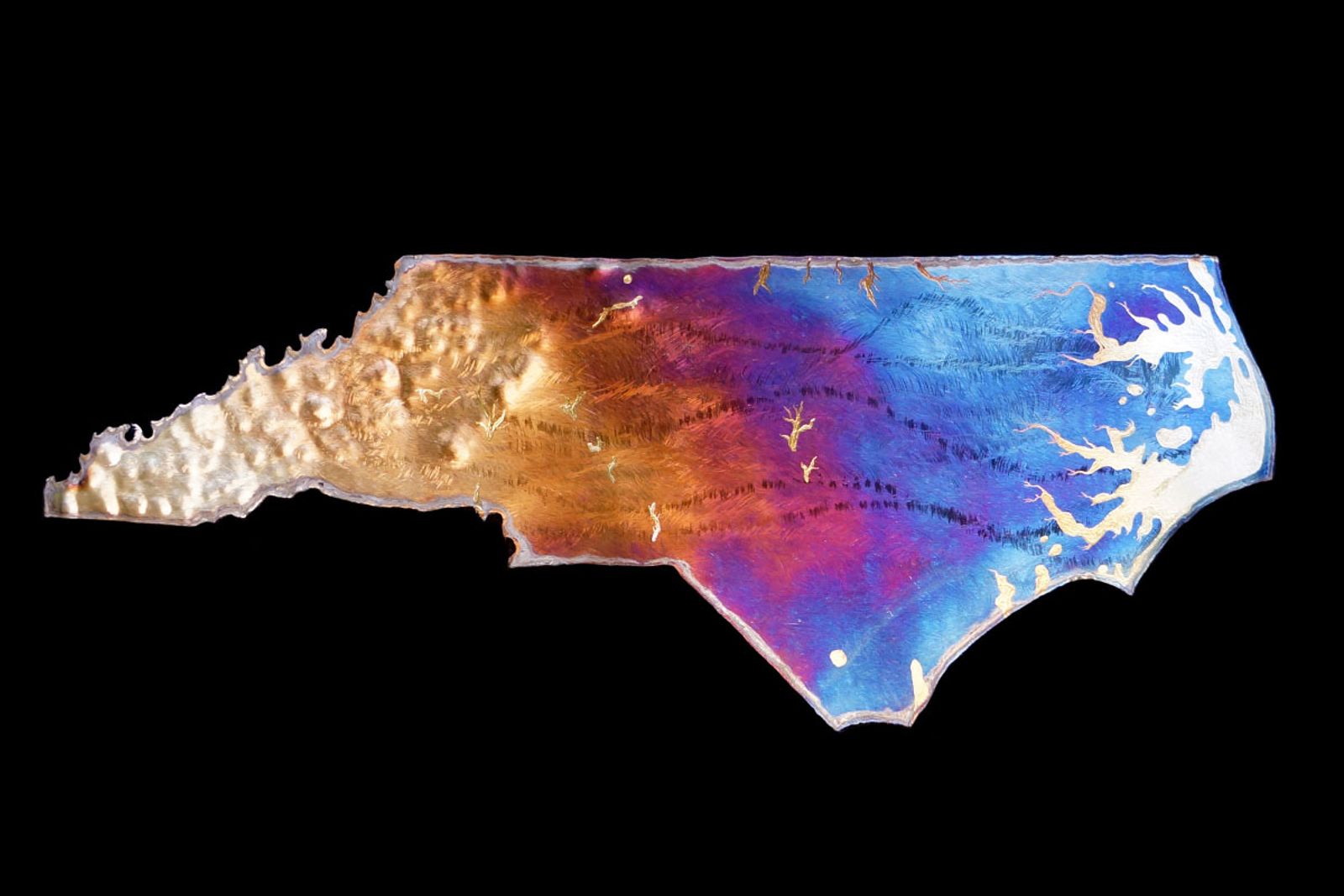 This North Carolina map sculpture is wall hanging, made entirely of stainless steel, colored using only heat patinas, and is safe to be kept outdoors!