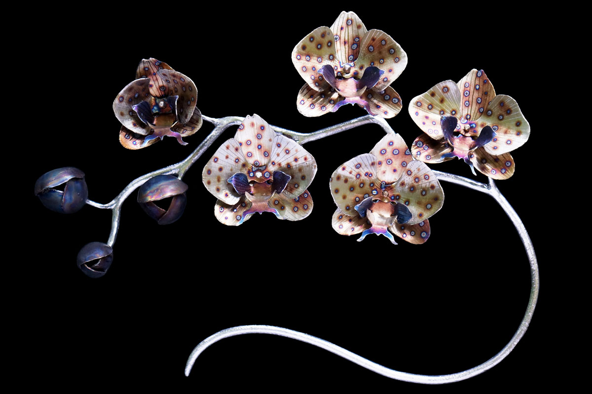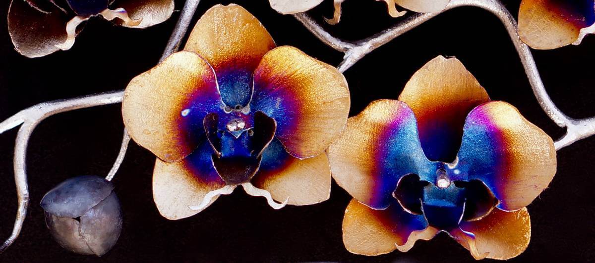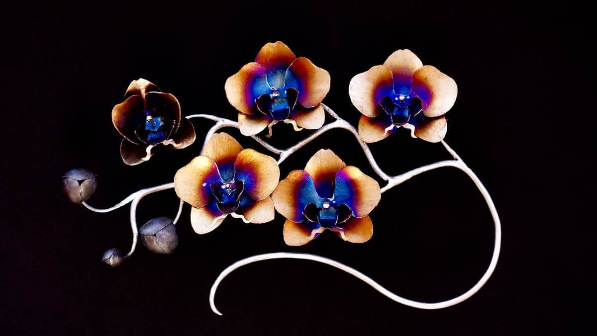This handmade orchid branch is a wall hanging sculpture based off of the Phalaenopsis Blume, is made entirely of stainless steel, colored using only heat patinas and is completely safe to be kept outside.