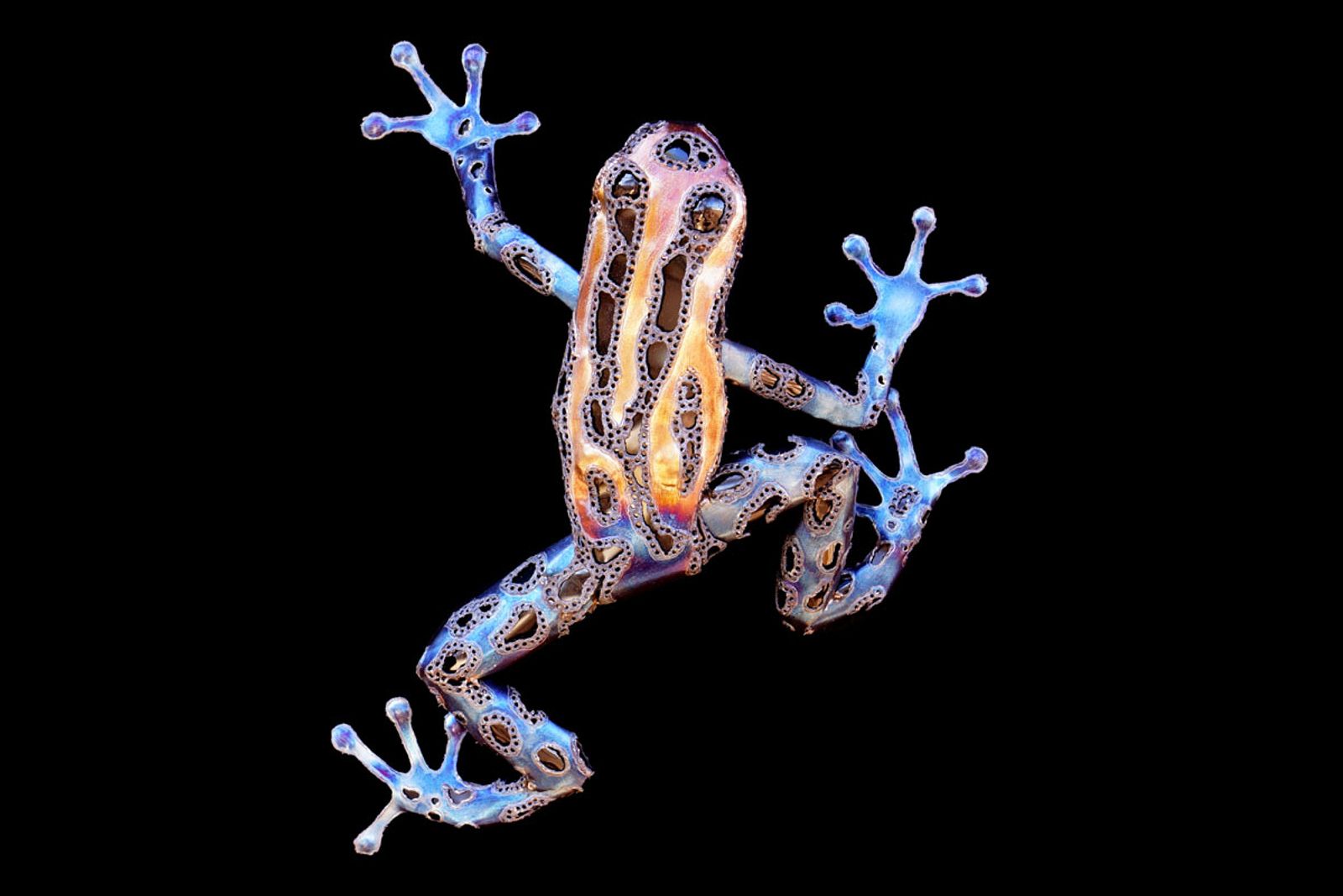 This poison dart frog sculpture is wall hanging, made entirely of stainless steel, colored using only heat patinas and a bit of black paint, and is safe to be kept outdoors!