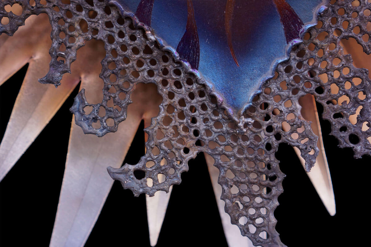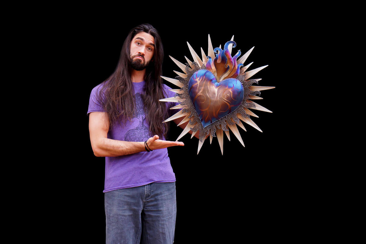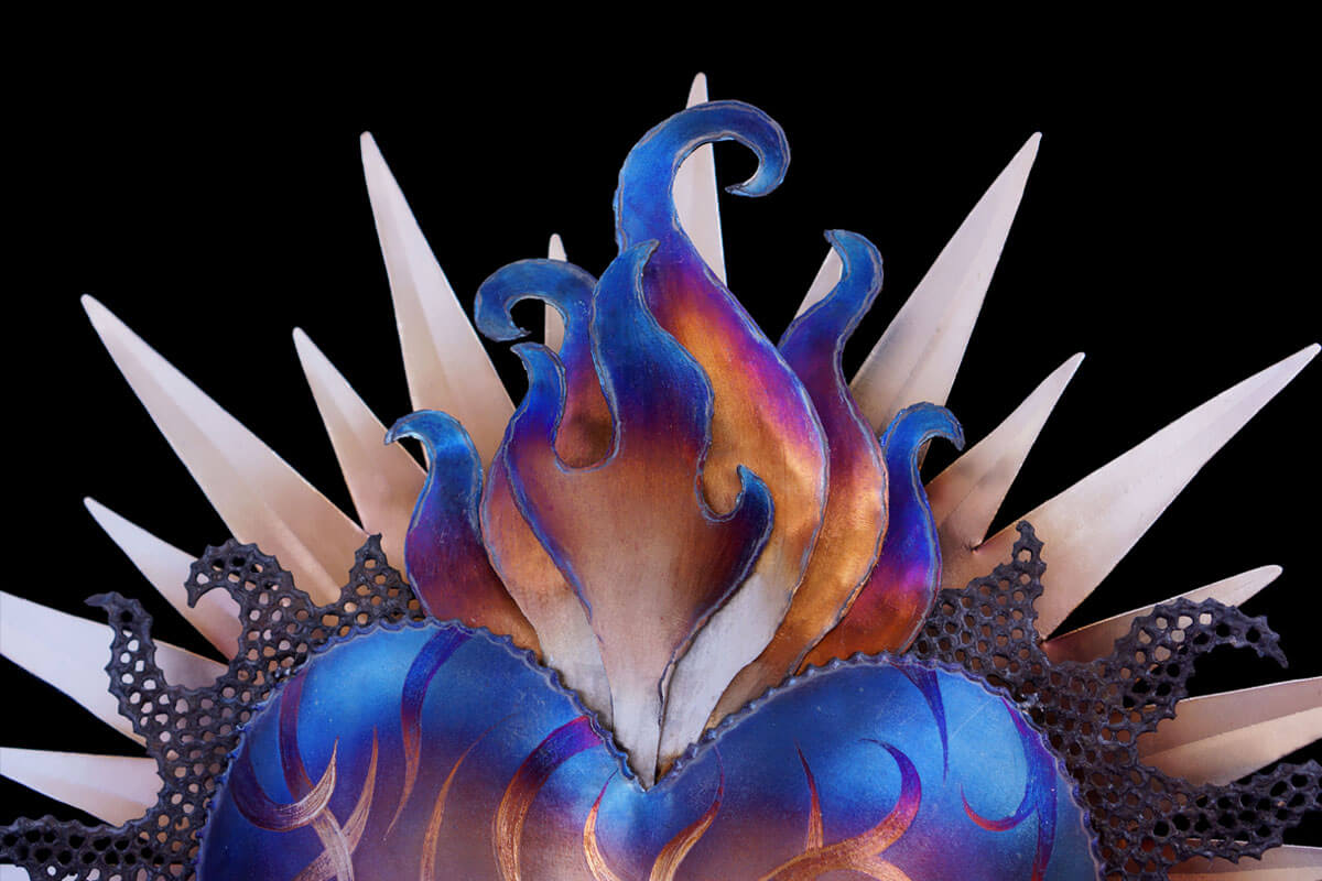 It was really fun creating the different layers of this sculpture. When designing it I had no idea how the flames would read and was worried that it might look too busy once all the layers were assembled. After I pieced everything together and took a step back i was surprised at how cohesive the piece was! My favorite part of this particular sculpture is the grind details in the heart. I achieved this by grinding a mat background first. Then I came and ground in swirling details with another grinding wheel. When complete the different grinds caught the light in unique ways achieving greater depth in the final product. This is something I have played around with before but I feel like this is the most successful application yet! I am excited to work with this technique more in the future.